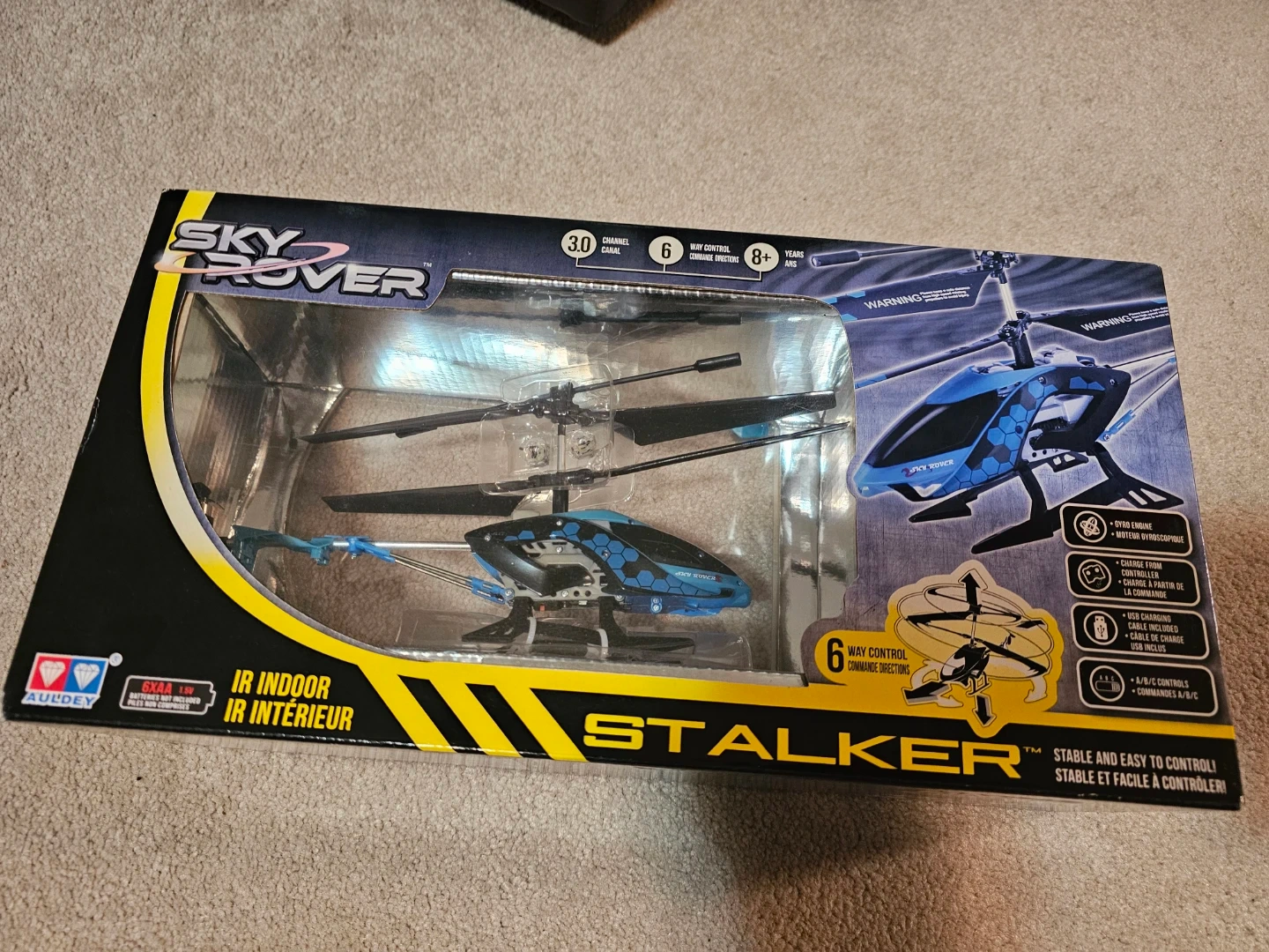 This is a Sky Rover Stalker RC helicopter for indoor use. It features 6-way control for manoeuvring. Comes with a USB charging cable. Recommended for ages 8+.