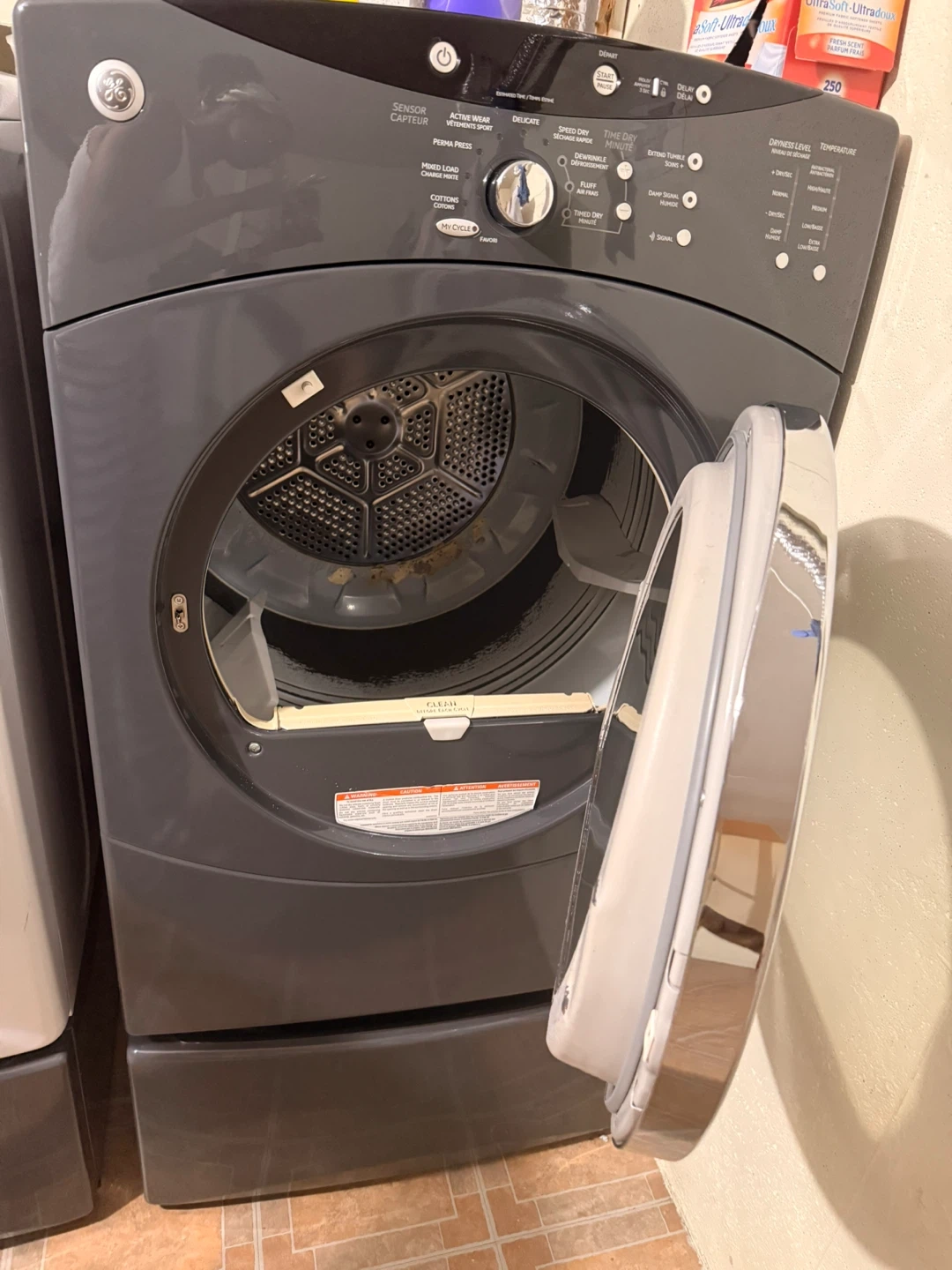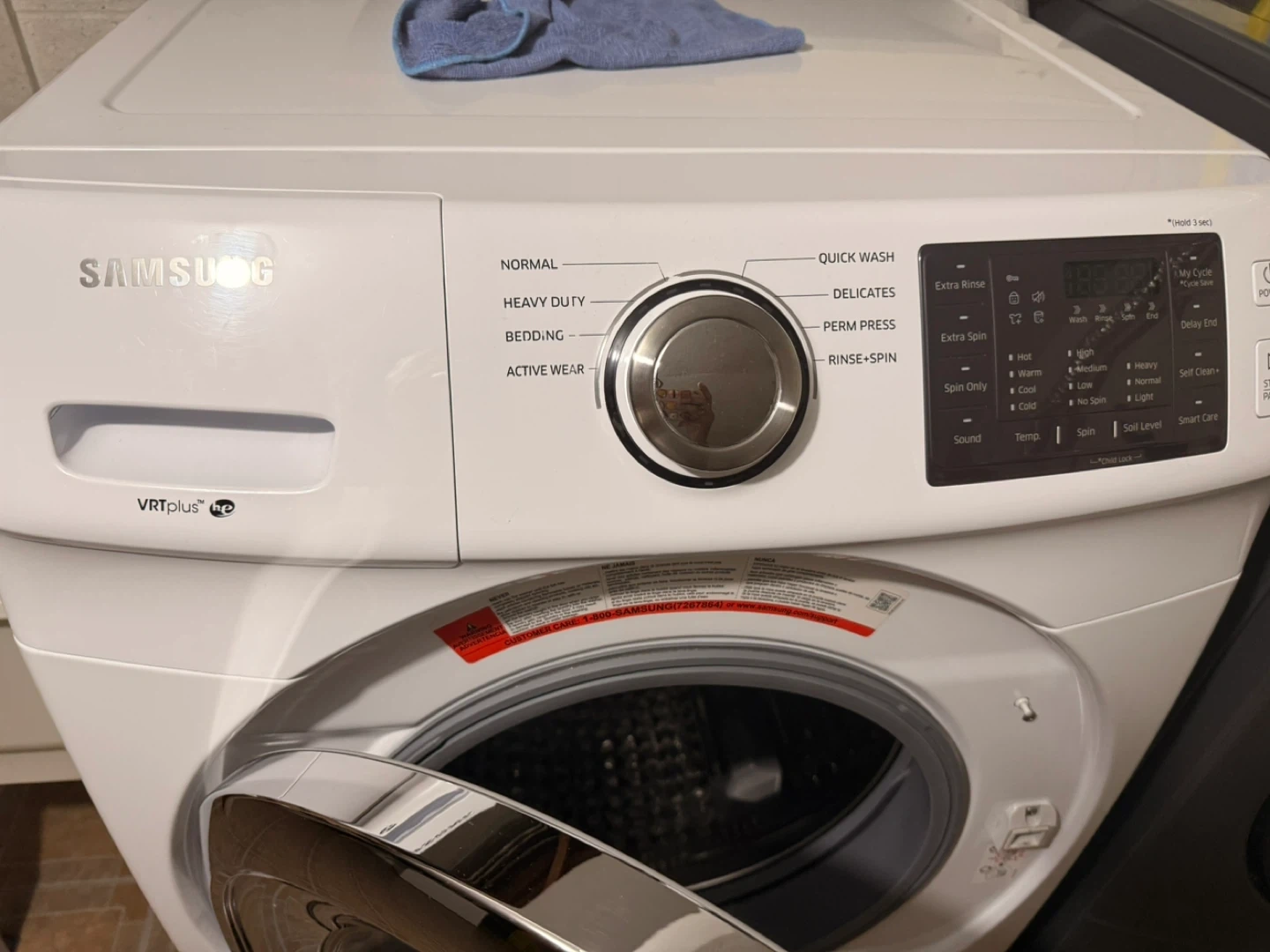 This is a white Samsung front load washing machine with VRT Plus technology. It features multiple wash cycles including Normal, Heavy Duty, Bedding, Active Wear, Quick Wash, Delicates, and Perm Press. It offers various temperature settings like Hot, Warm, Cool, and Cold, as well as spin speeds and soil levels. This machine is great for a variety of laundry needs!