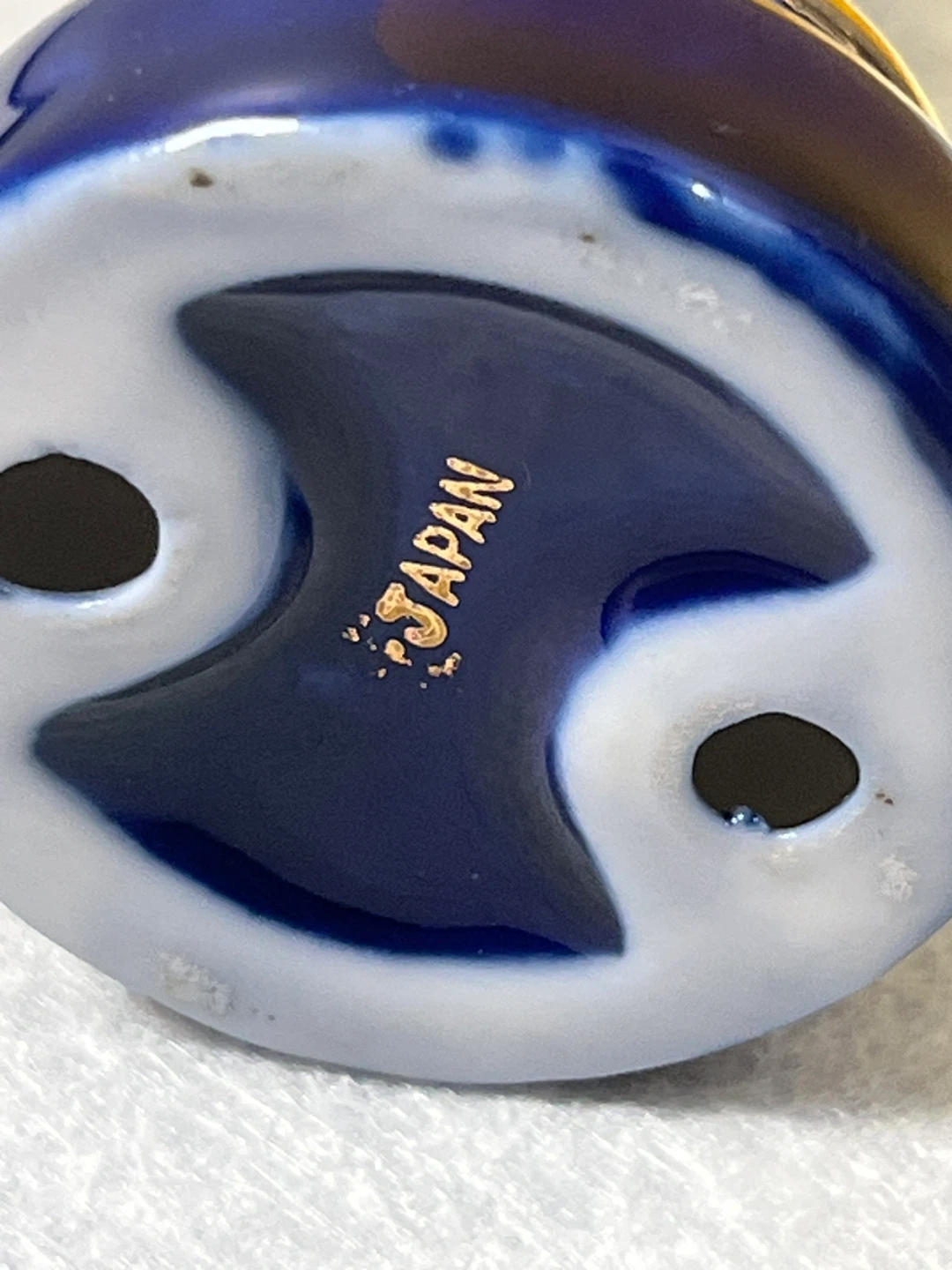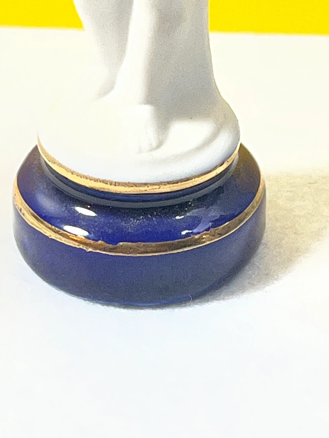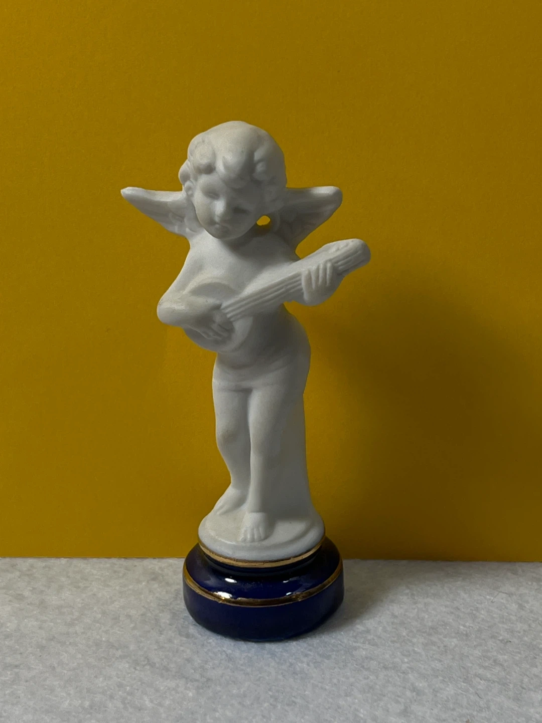This isn't your average figurine! This piece features a beautiful contrast between the soft, unglazed bisque porcelain of the angel and the deep, reflective luster of the gold-trimmed cobalt base.