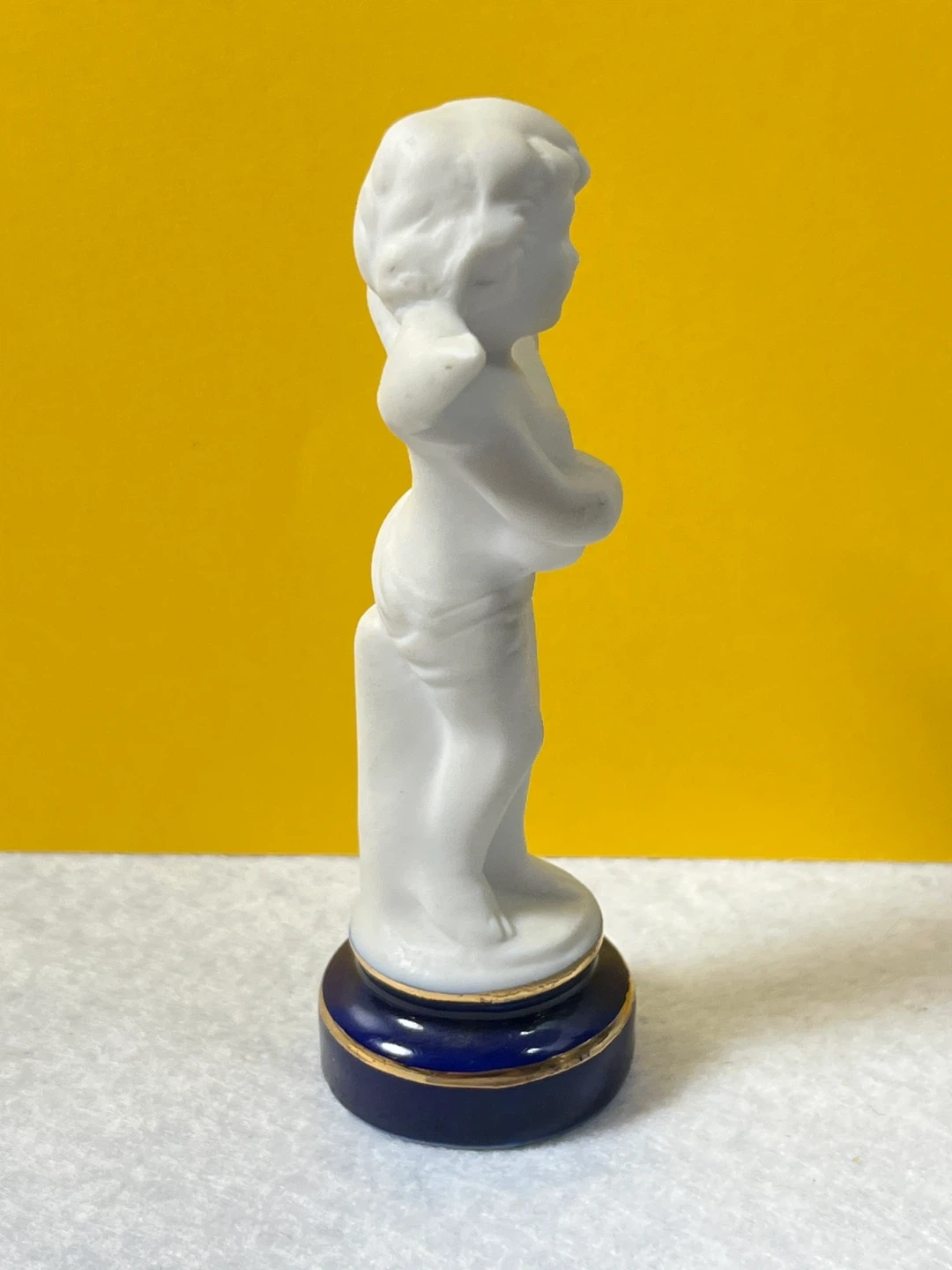 This isn't your average figurine! This piece features a beautiful contrast between the soft, unglazed bisque porcelain of the angel and the deep, reflective luster of the gold-trimmed cobalt base.