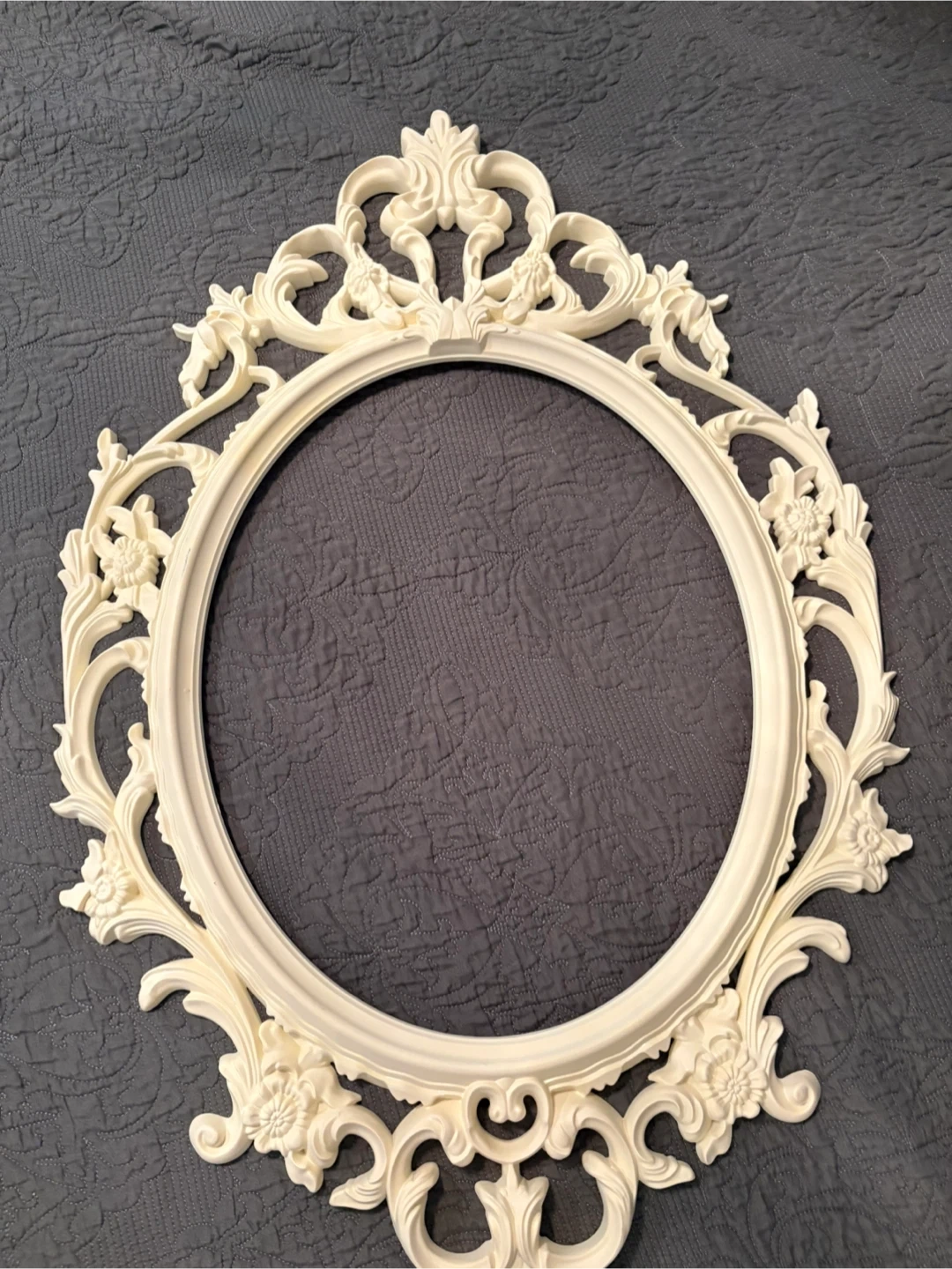 An ornate oval wall decor frame in a classic cream finish. It's crafted with intricate floral and scroll details, adding a touch of vintage charm to any space. This frame's decorative design makes it a lovely accent piece for your home.