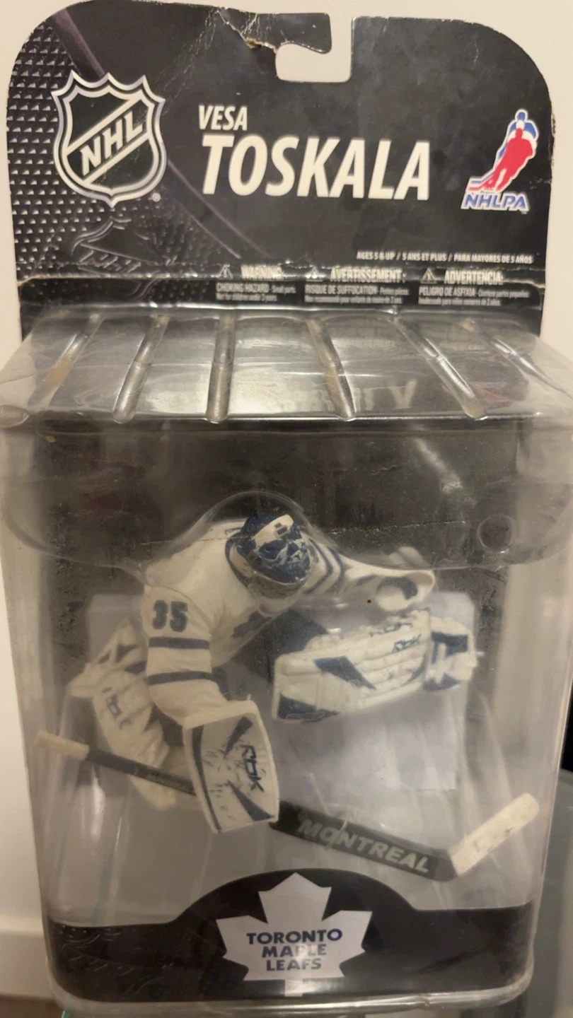 This is a Vesa Toskala action figure for the Toronto Maple Leafs. It's an NHL collectible. Ages 5 and up.