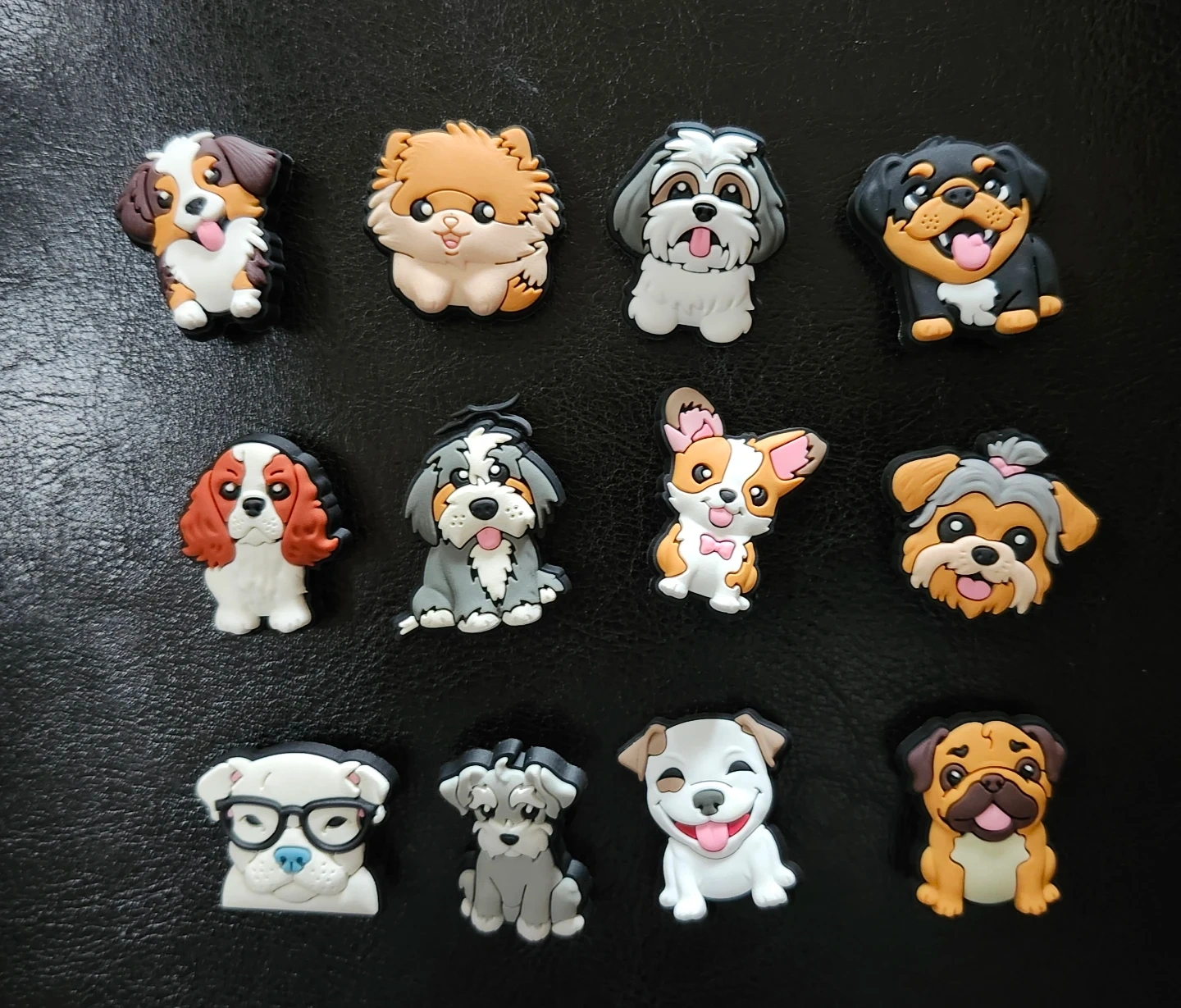 A collection of 17 assorted dog charms, perfect for personalizing your shoes. These fun charms feature various breeds and styles, including Dachshunds and other popular dog breeds. They're made from durable PVC material.