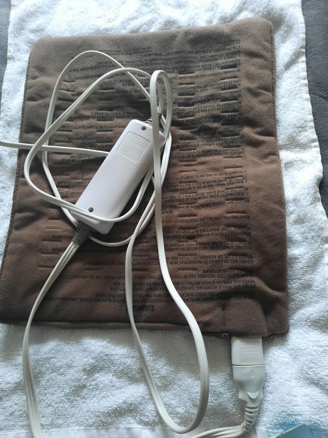 A brown heating pad with a white wired controller. It has multiple heat settings. Machine washable pad.