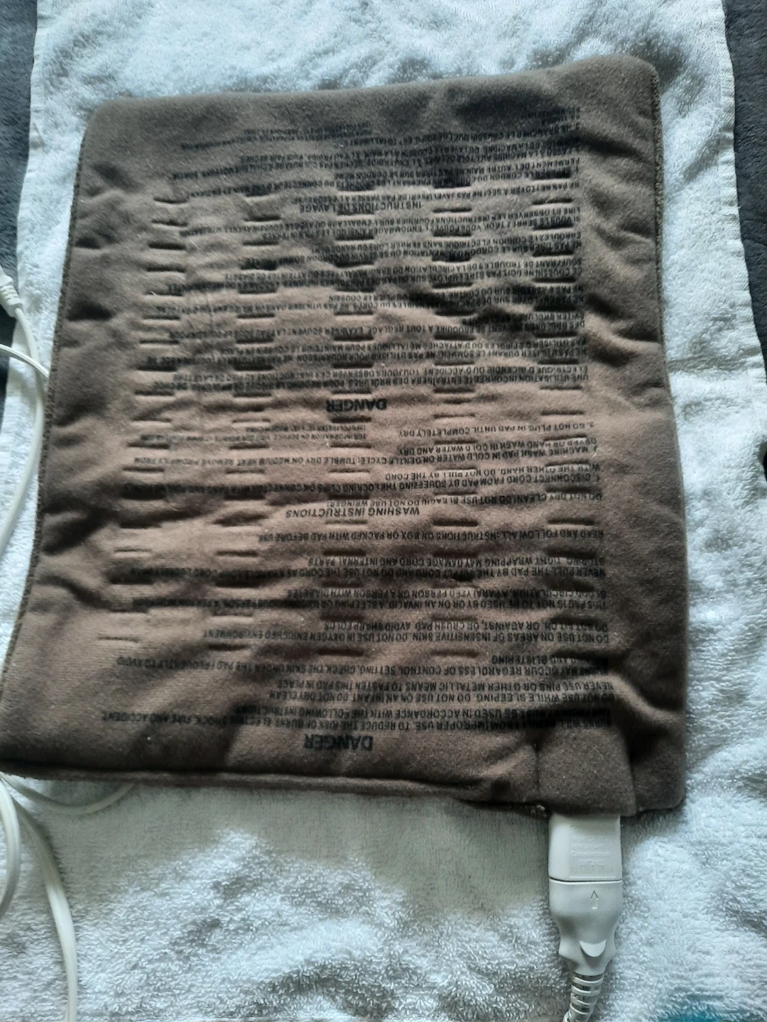 A brown heating pad with a white wired controller. It has multiple heat settings. Machine washable pad.