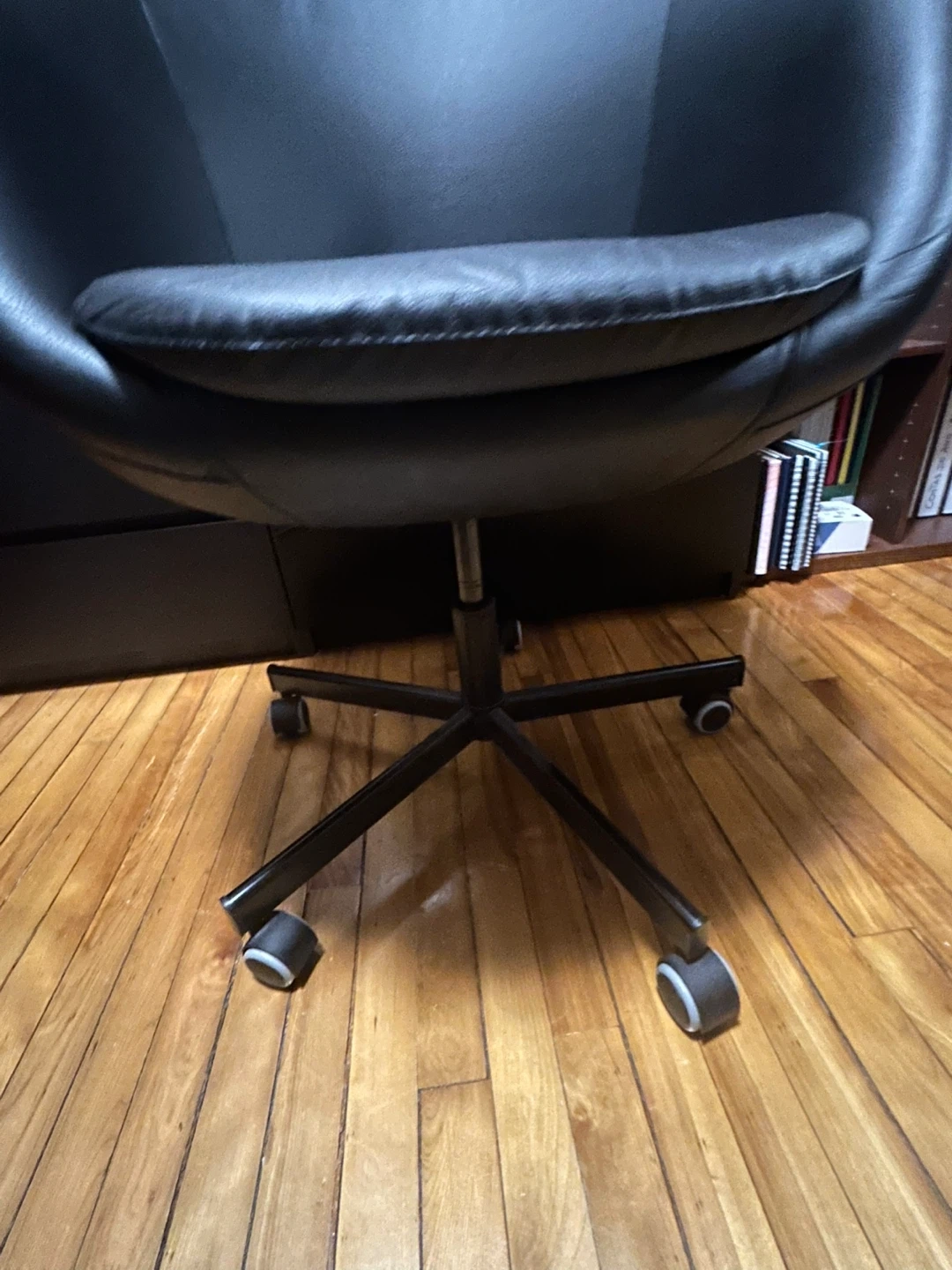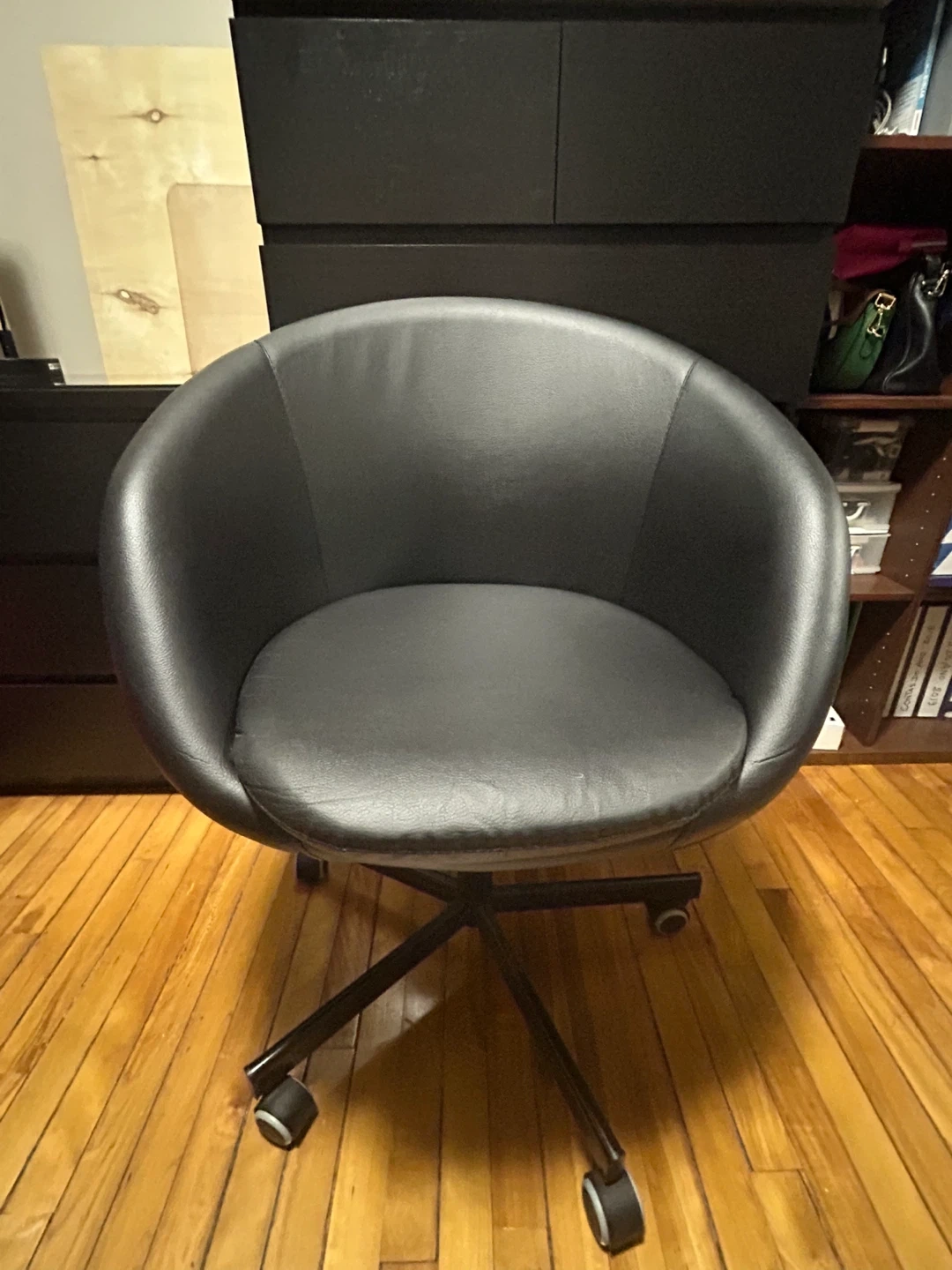 Comfortable black office chair with a swivel base and wheels. It's upholstered in faux leather and features a padded seat and back. Its modern design fits well in any home or office setting.