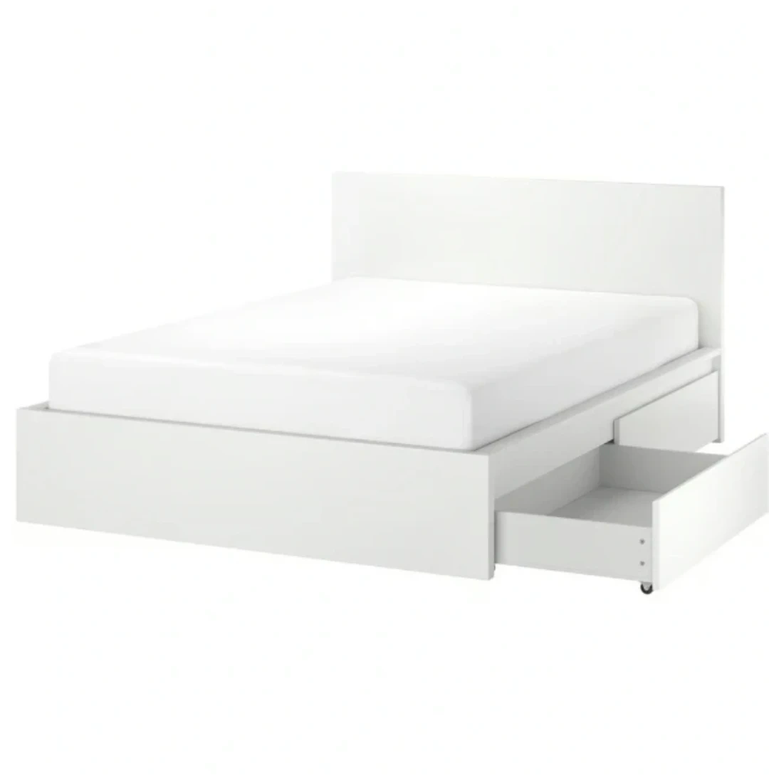 White bed frame with a headboard. Comes with two storage drawers underneath for extra space. White colour.
