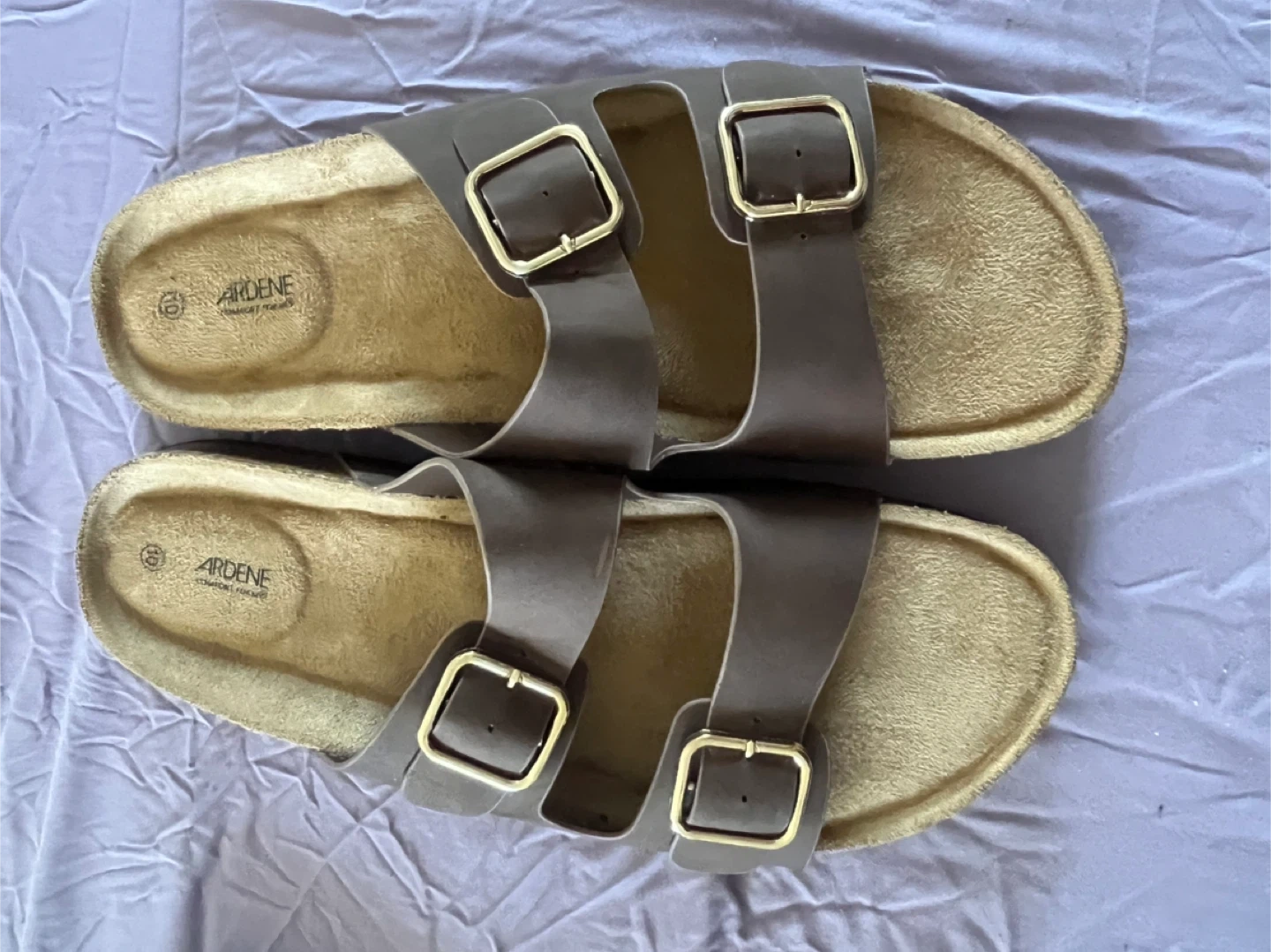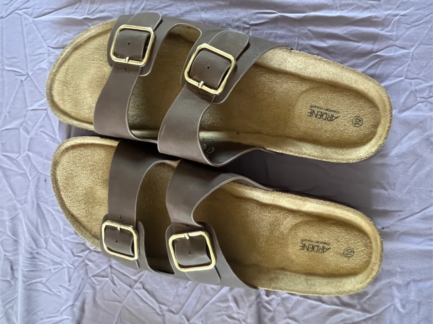 ARDENE women's double buckle slide sandals. Brown color with gold-toned hardware. Comfortable cork footbed and synthetic straps. Size is women’s 10.
