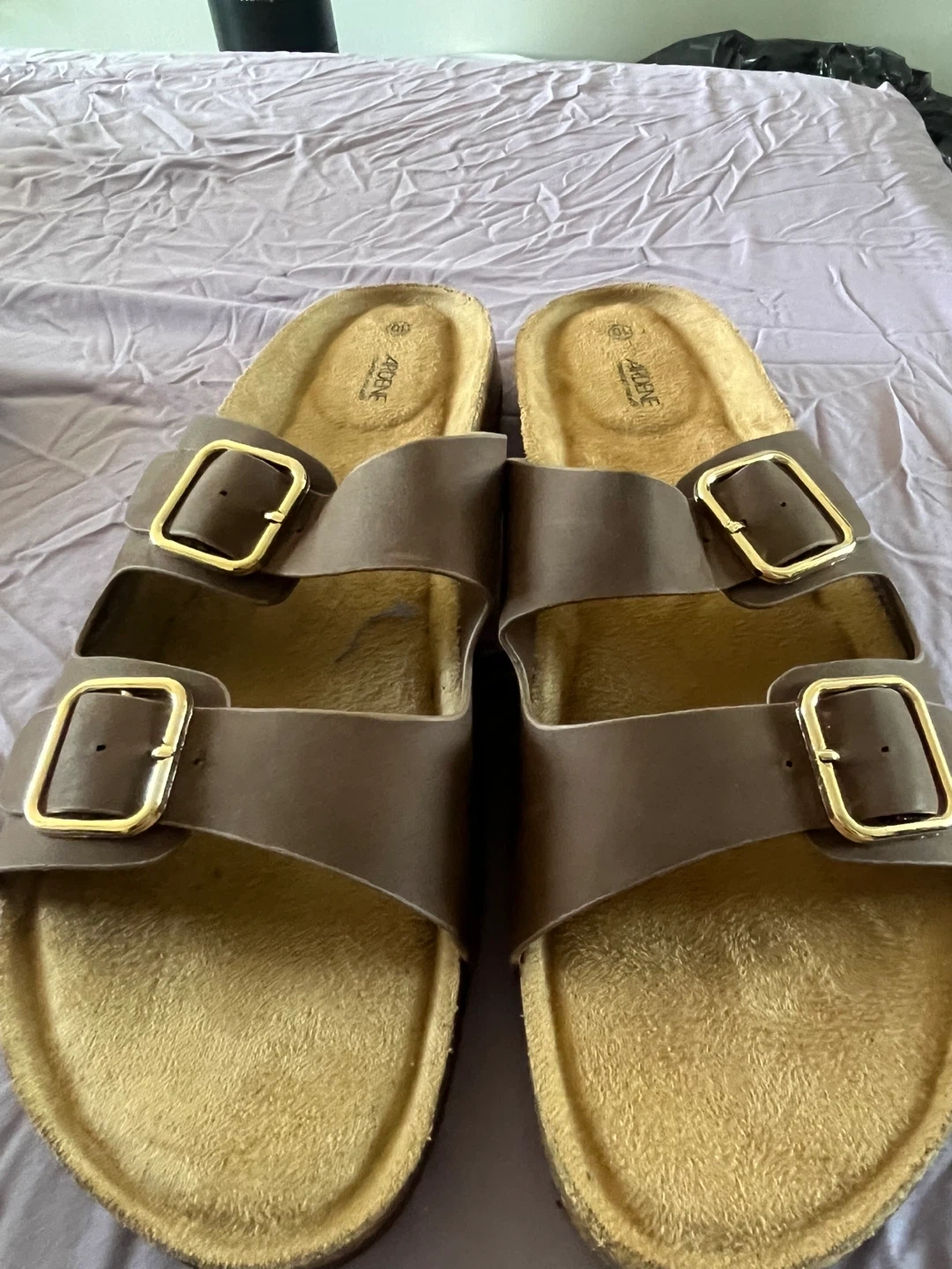 ARDENE women's double buckle slide sandals. Brown color with gold-toned hardware. Comfortable cork footbed and synthetic straps. Size is women’s 10.