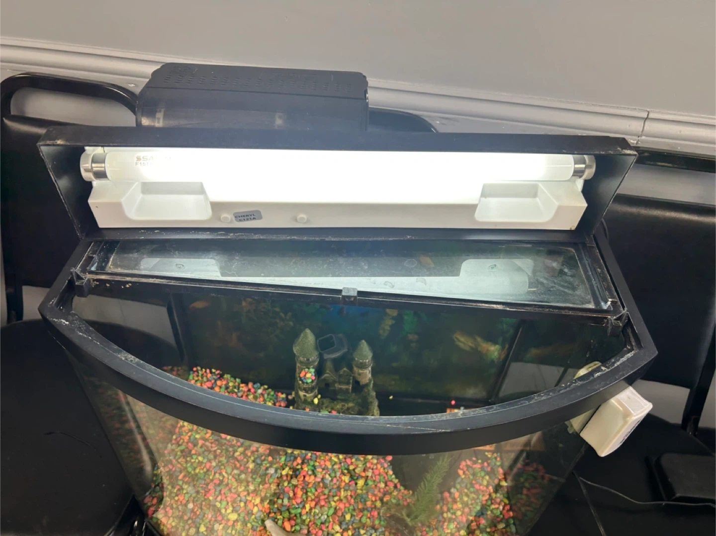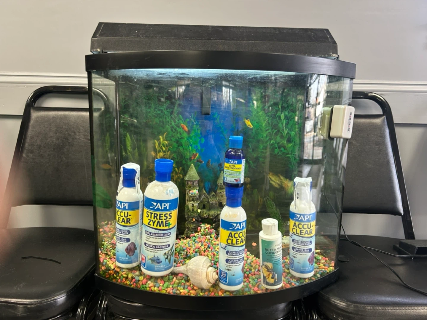 Selling a used fish tank. It comes with gravel, decorations, and a filter. Also included are various API water treatment solutions such as Stress Zyme and Accu-Clear.