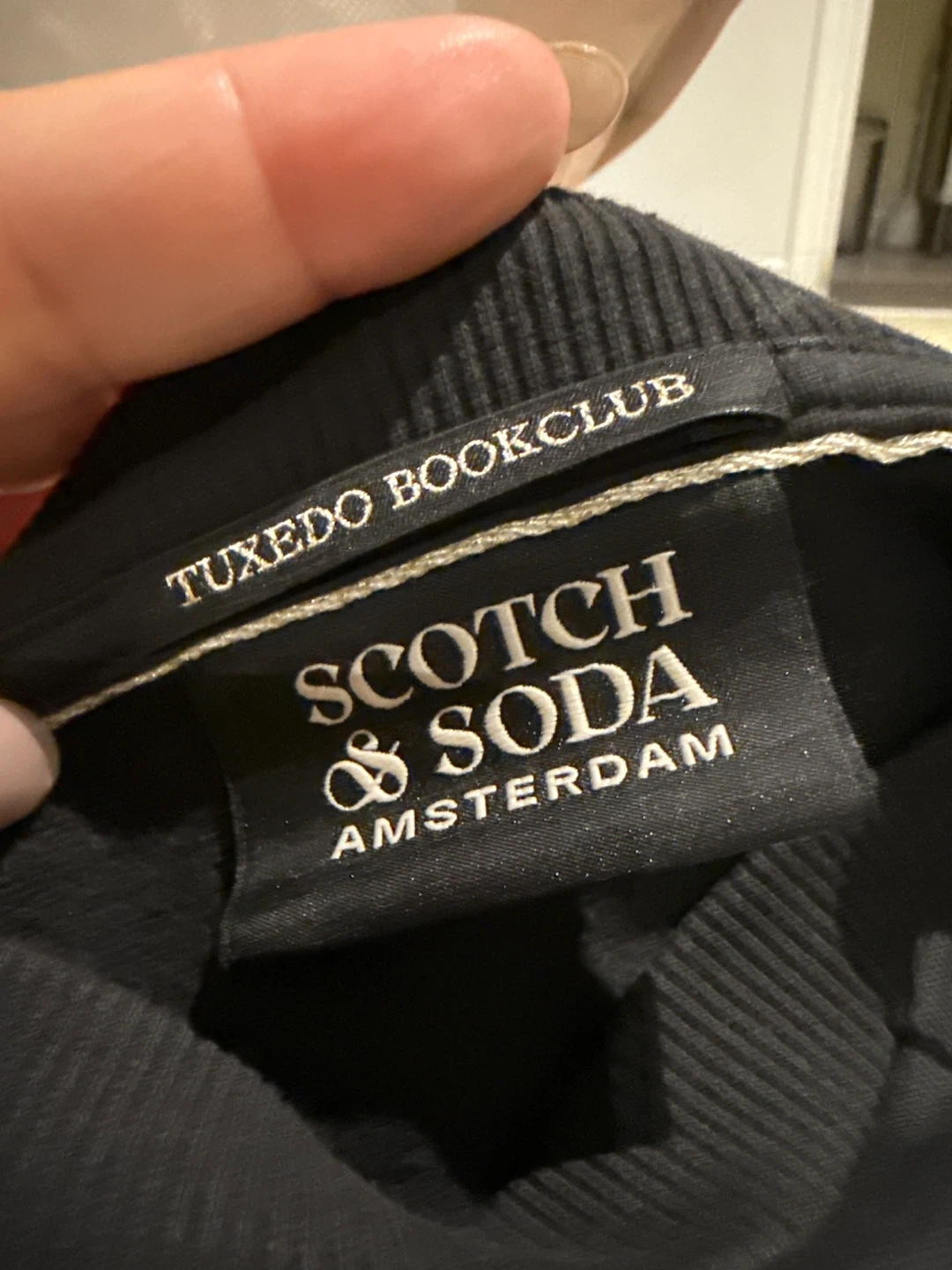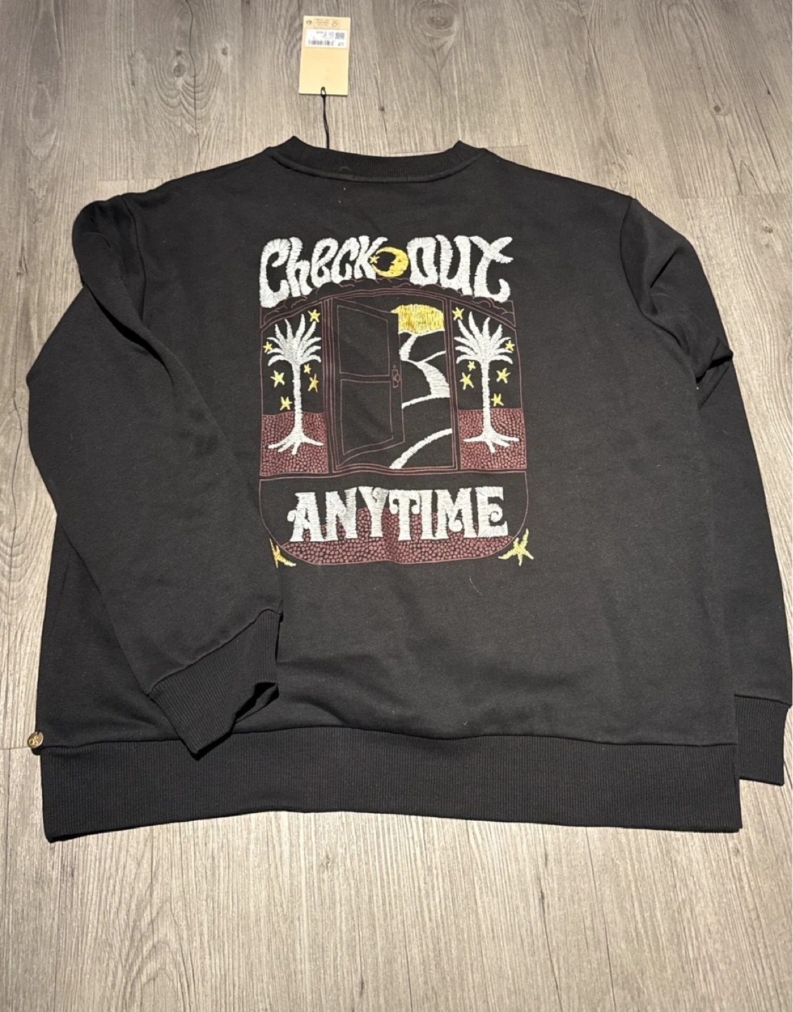 NWT Black crewneck sweatshirt from Scotch & Soda Amsterdam (Tuxedo Bookclub) with a moon graphic on the front chest and “check out anytime” on the back. New with tags. Machine wash cold. Size M.