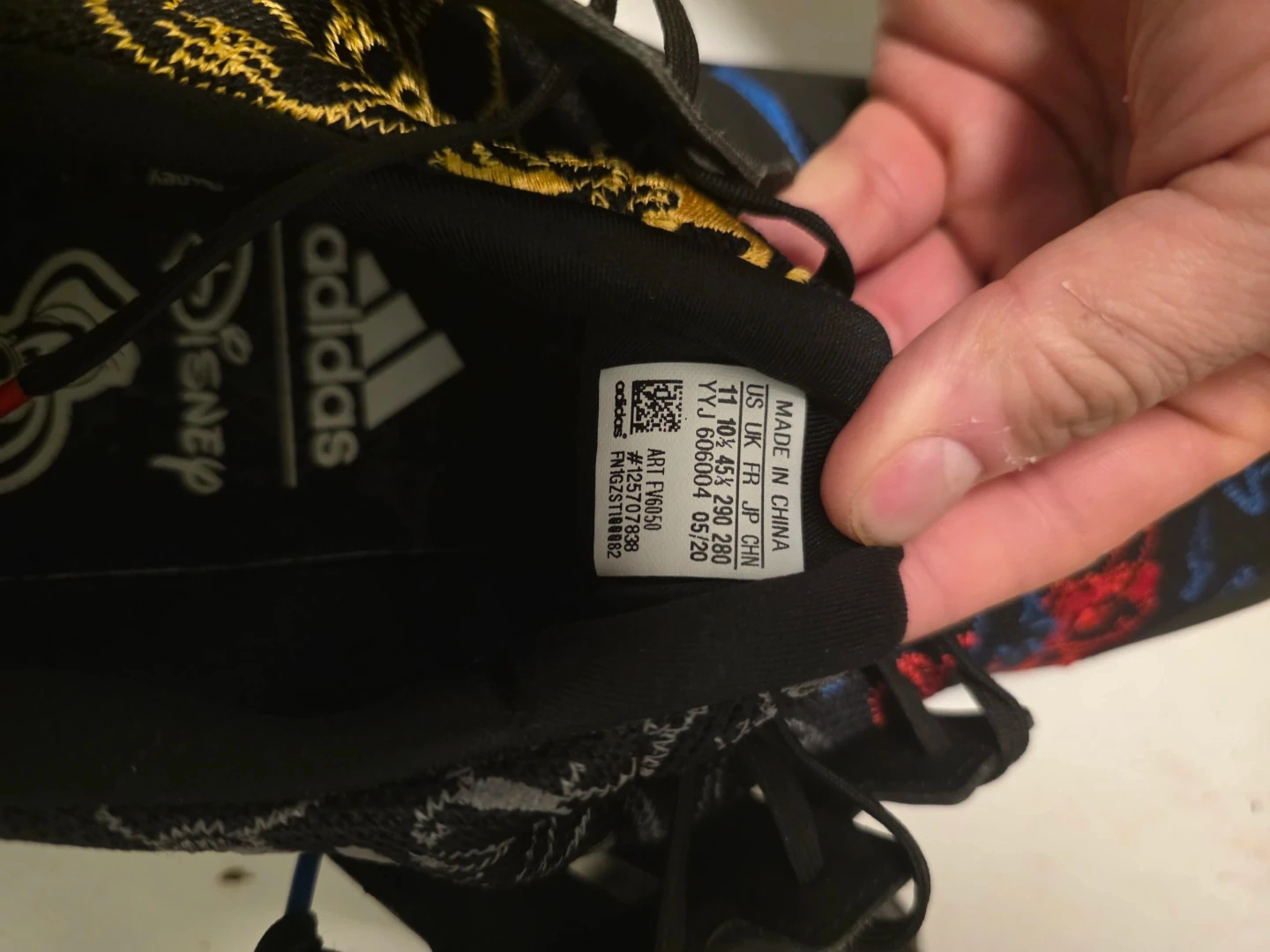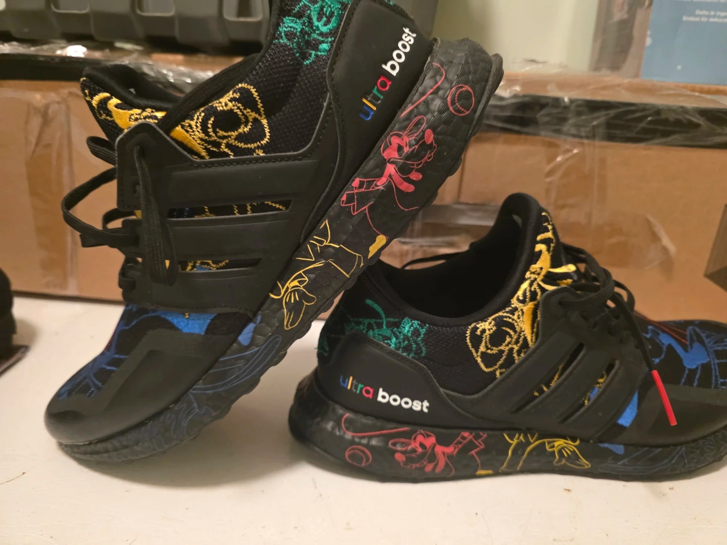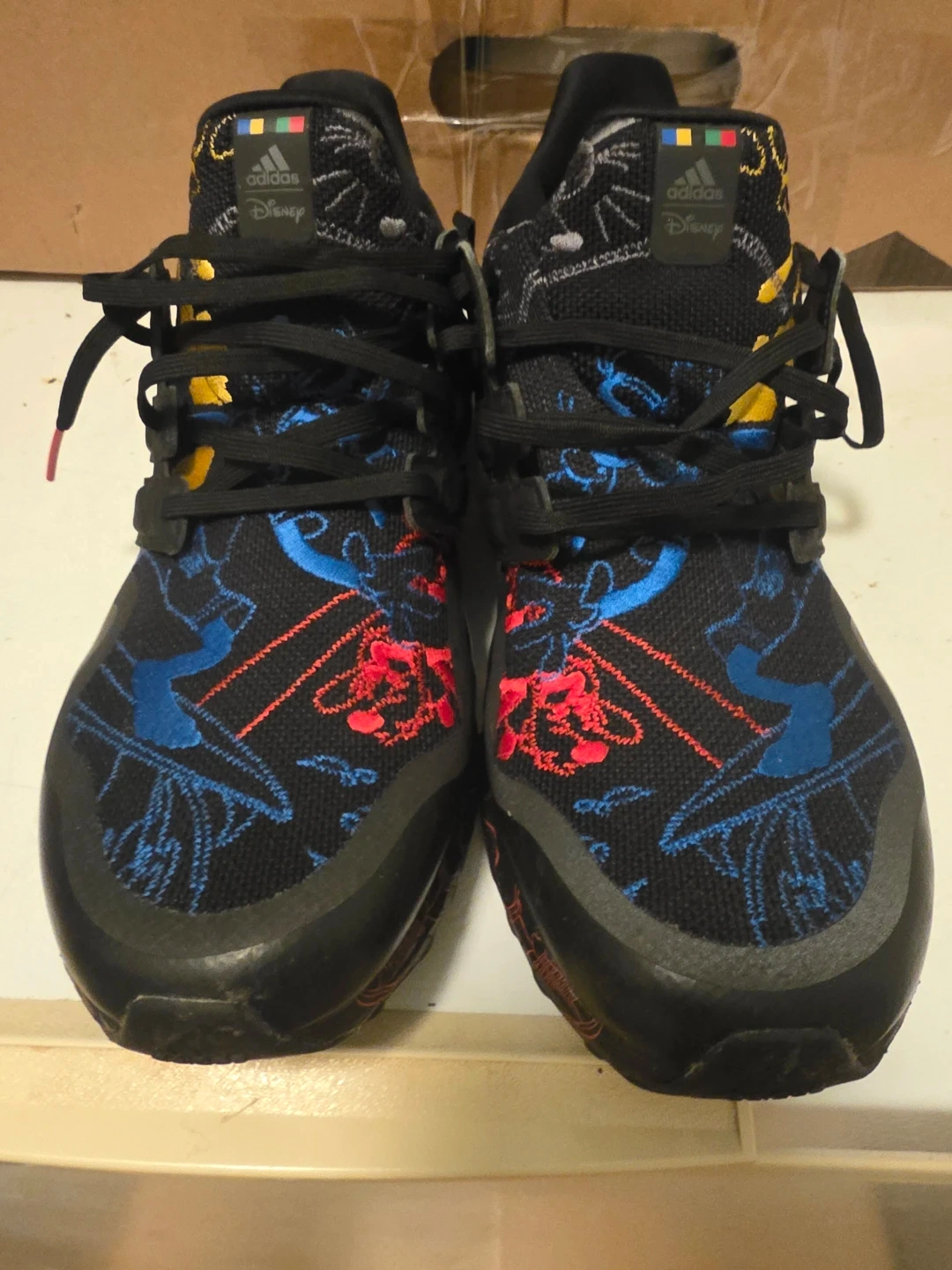 Selling a pair of Adidas Ultraboost shoes with a fun Disney design! They're black with colourful accents and feature Disney characters. The soles are Continental brand. Great for running or casual wear!