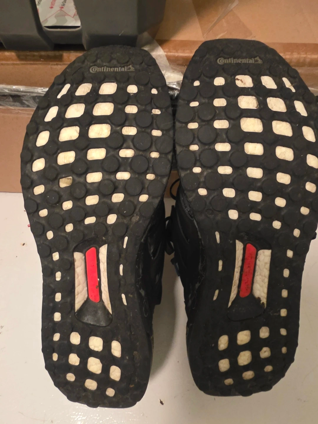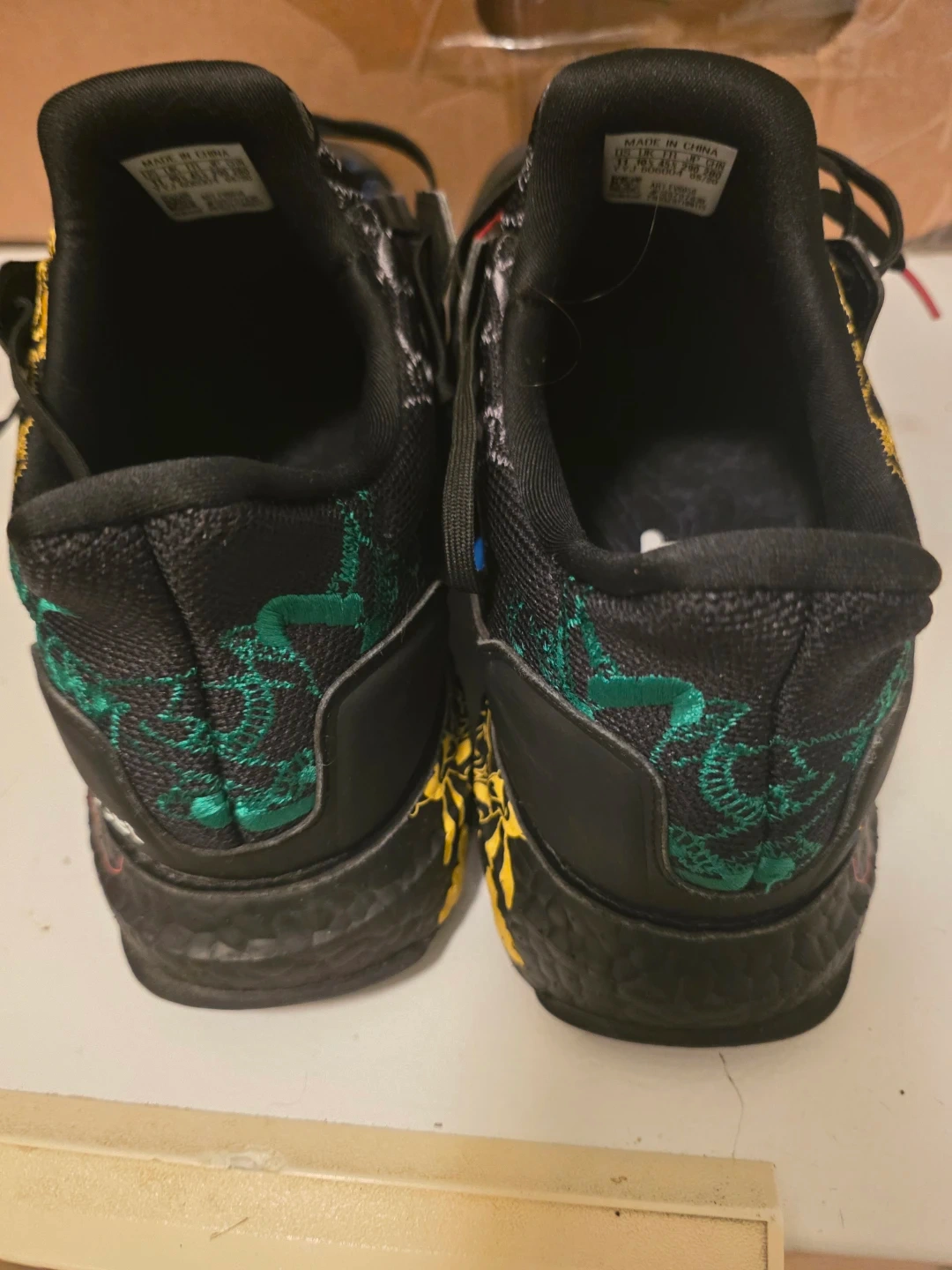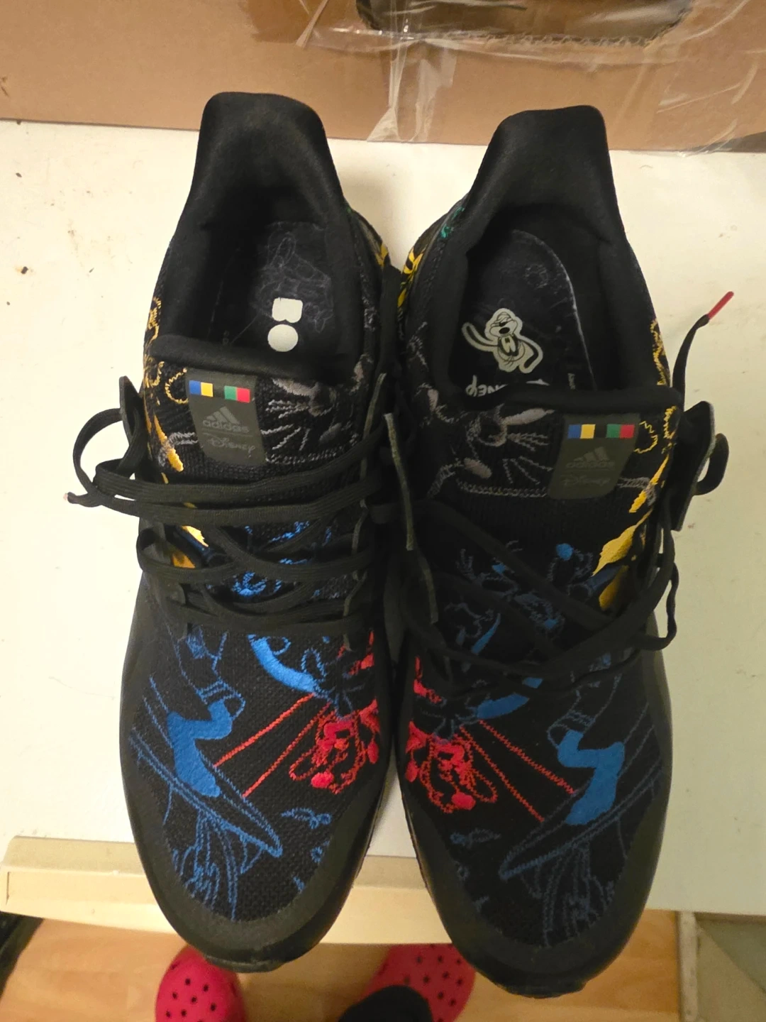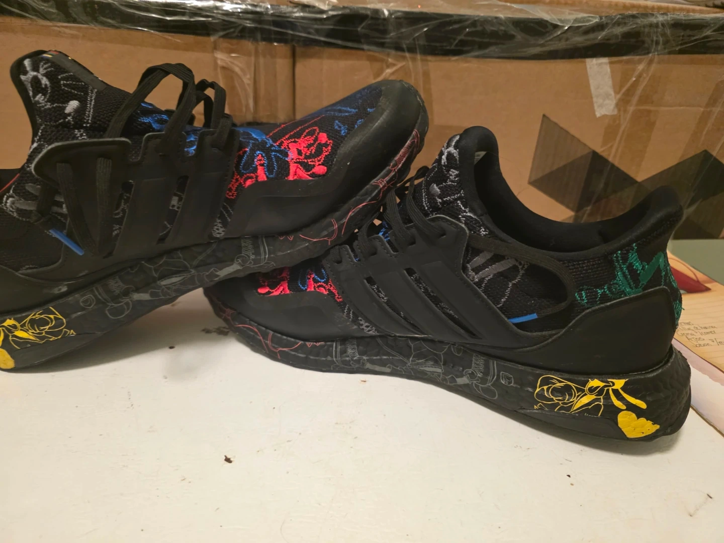 Selling a pair of Adidas Ultraboost shoes with a fun Disney design! They're black with colourful accents and feature Disney characters. The soles are Continental brand. Great for running or casual wear!