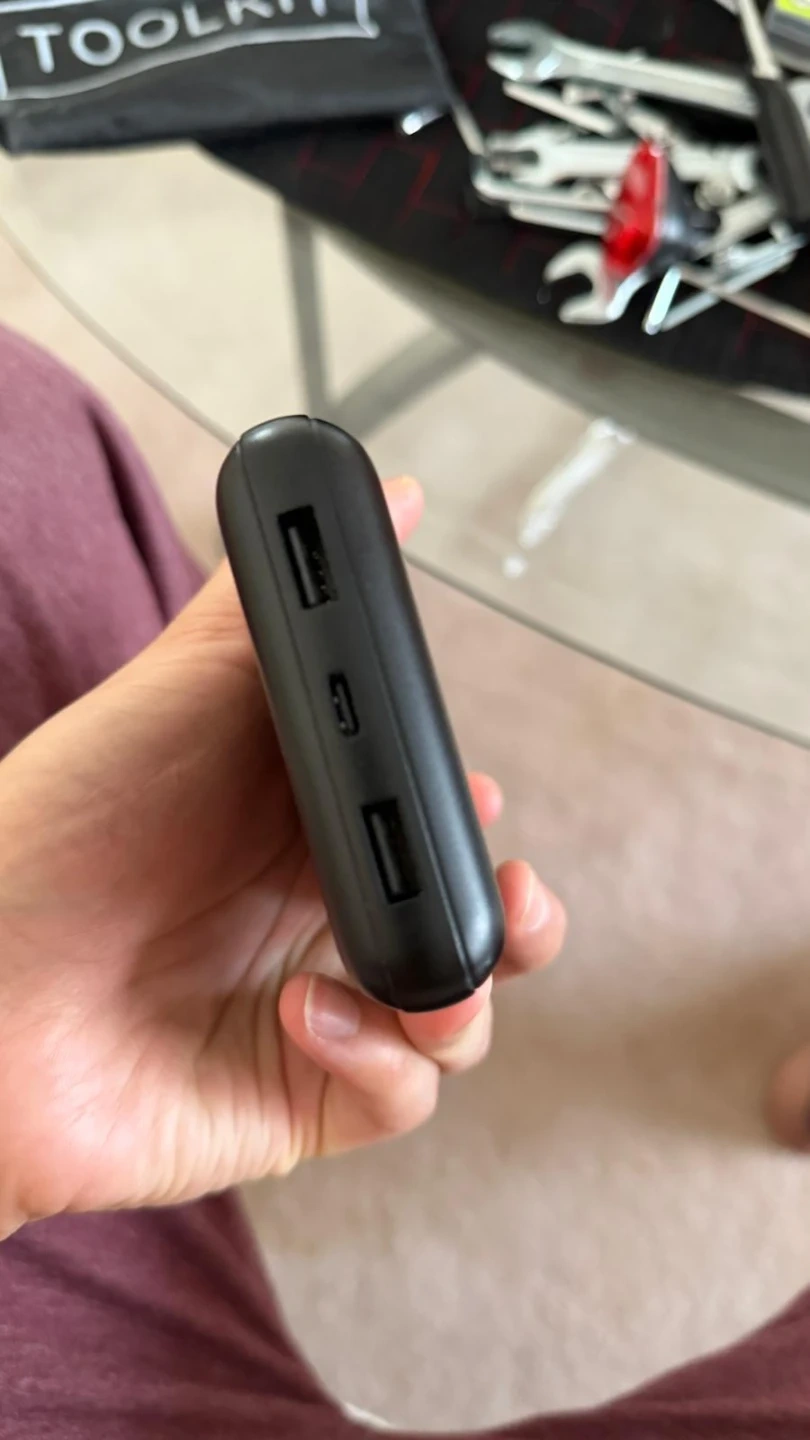 This is a black Belkin 20,000mAh power bank, model BP8012. It has two USB-A ports and one USB-C port for charging. Great for keeping your devices powered up on the go!