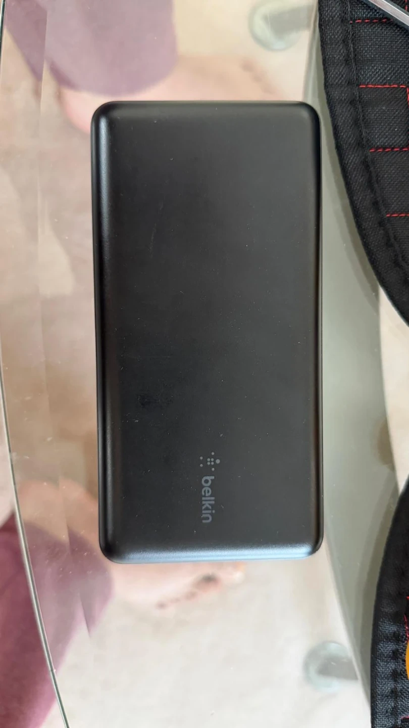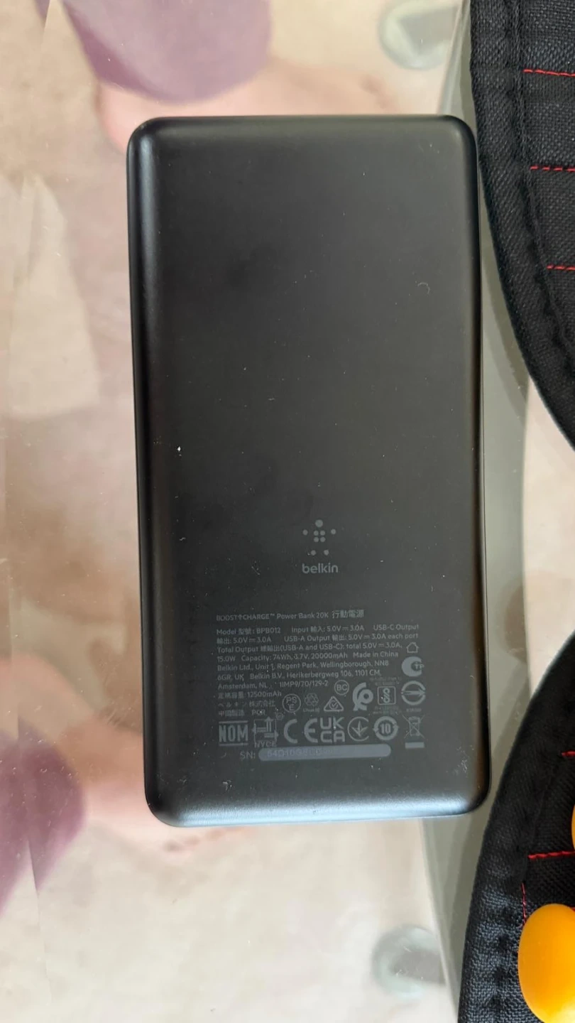 This is a black Belkin 20,000mAh power bank, model BP8012. It has two USB-A ports and one USB-C port for charging. Great for keeping your devices powered up on the go!