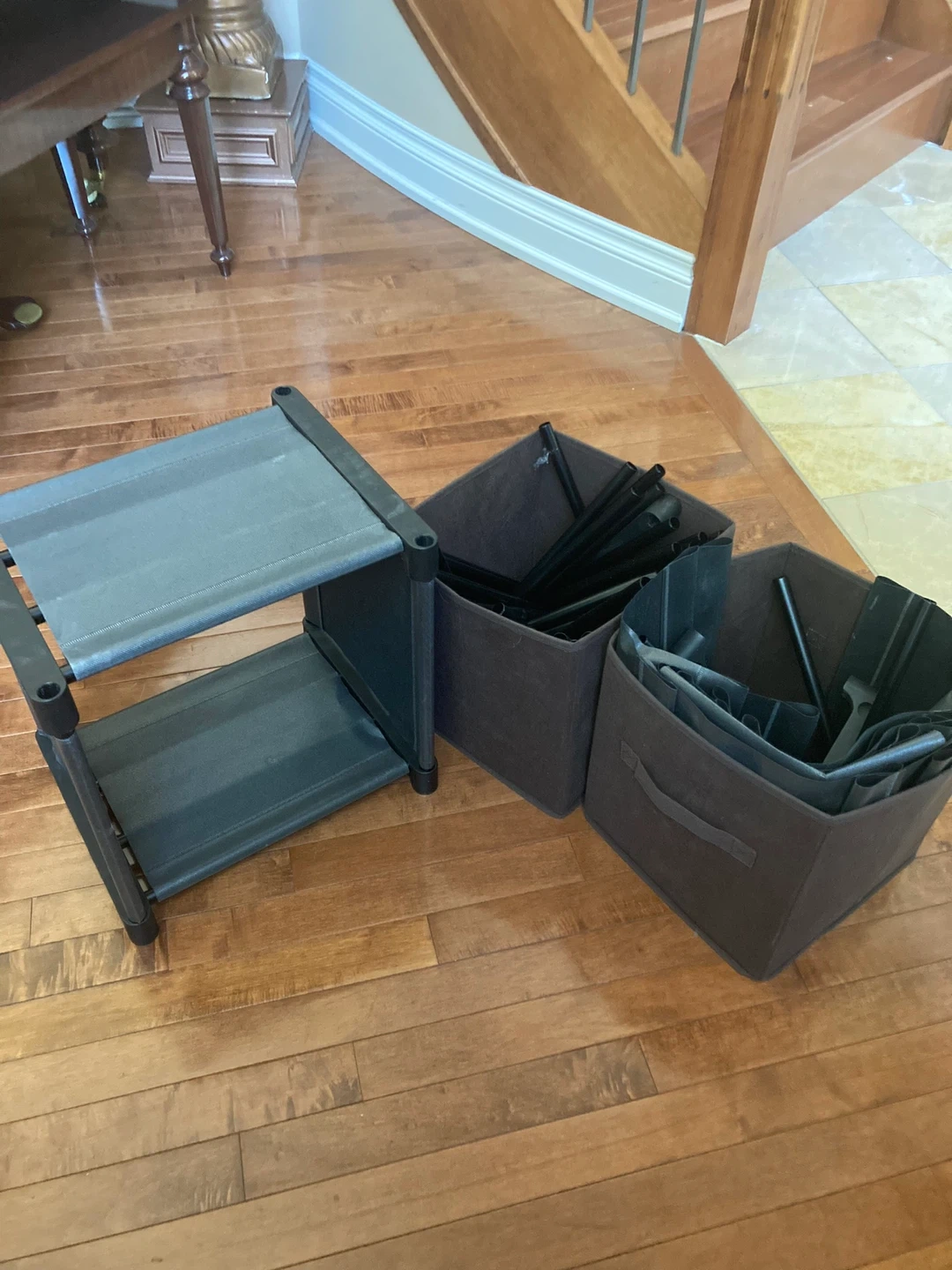 A lightweight modular shelving unit with fabric bins. It's in great condition and ready for a new home. Perfect for organizing toys, clothes, or anything else you need to store. One module put together for example. Fits standard cubes.
