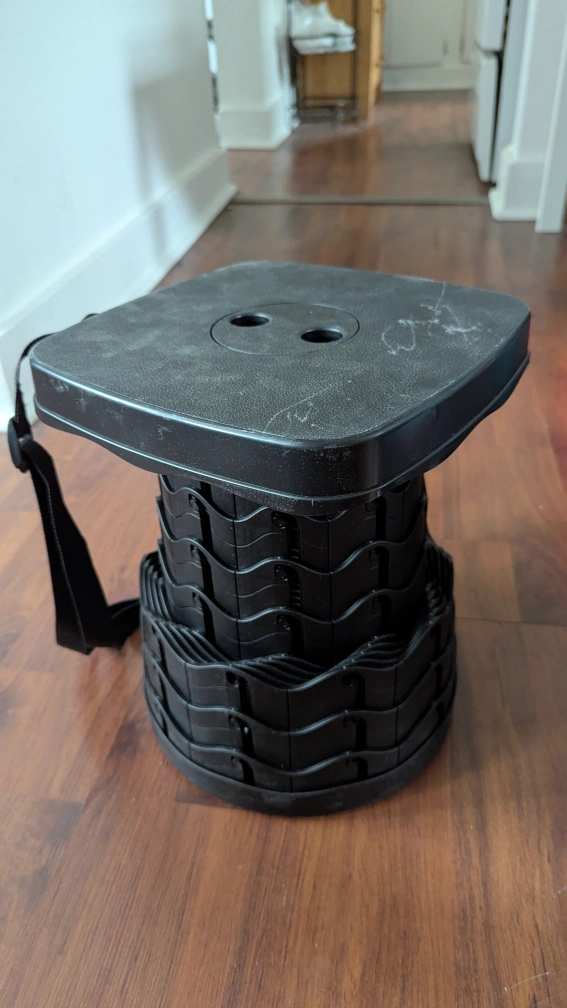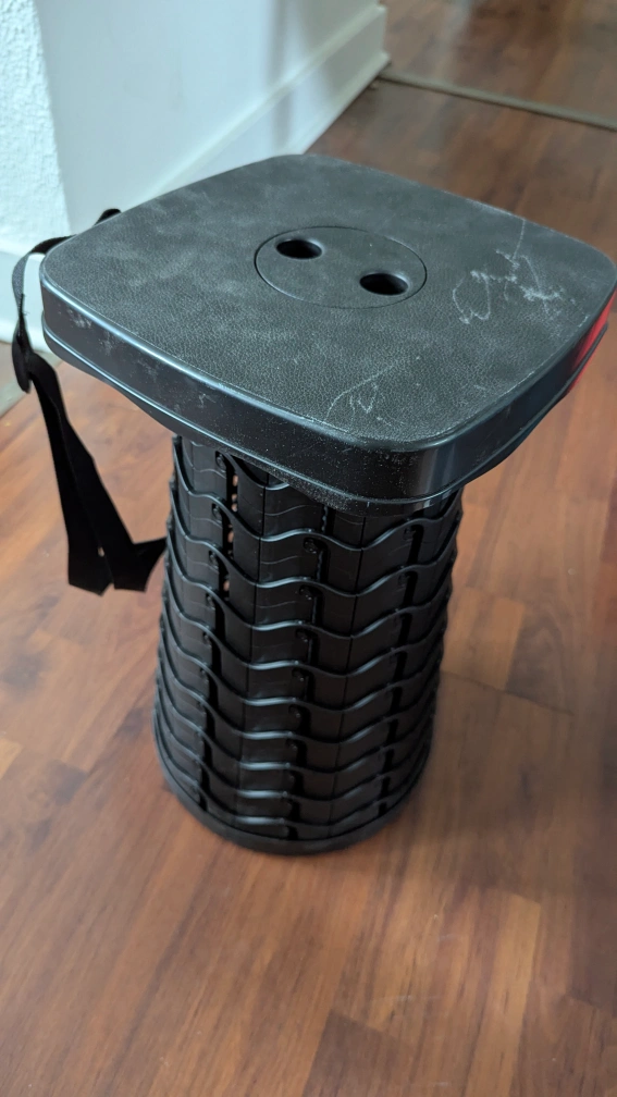 Selling a handy portable telescopic folding stool in black. It's great for camping, fishing, or just having an extra seat around the house. It shows some signs of use, but is still very functional and ready for a new home! Lightweight and easy to carry around, it's perfect for on-the-go seating