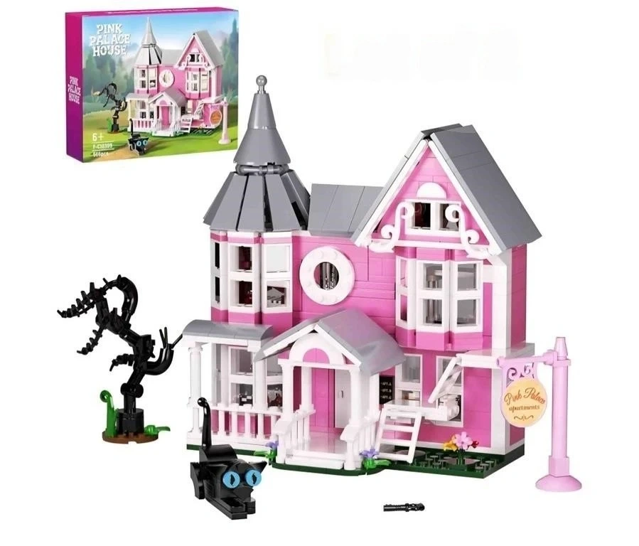 This is a Pink Palace House building block set. It includes the main house structure, a black cat figure, and a spooky tree accessory. The set is recommended for ages 6 and up and contains 646 pieces. It's a fun building project for kids!