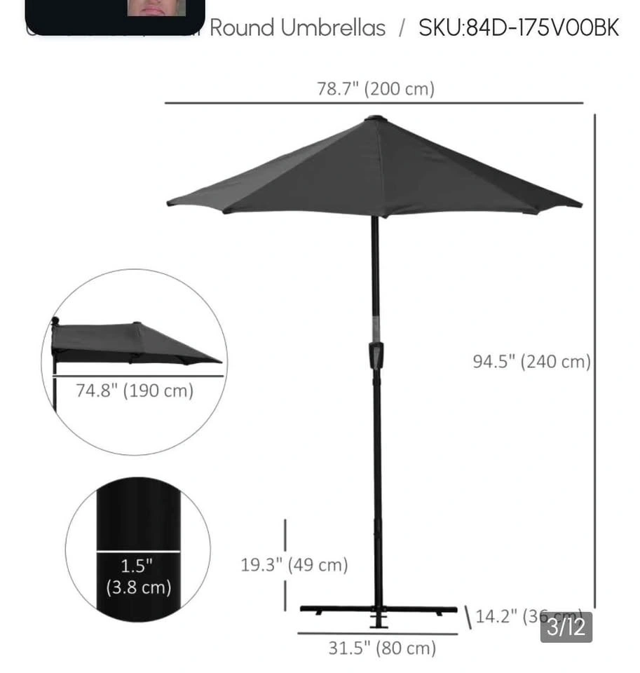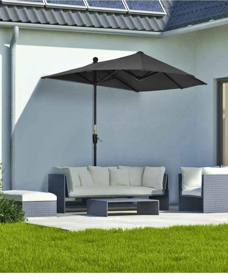 Outsunny 6.6 x 6ft Half Patio Umbrella Outdoor Parasol with Double-Sided Canopy, Crank Handle, Base for Garden, Balcony, Black. Feel free to message if you have any questions!