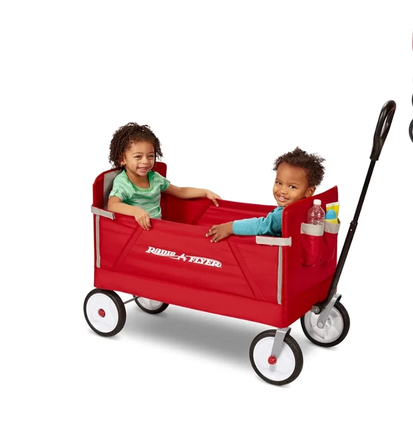 This Radio Flyer wagon is red with four wheels. It's made of durable fabric and has a comfortable handle for pulling. It comes with cup holders and storage pockets. Convets into a seat and it foldablem. It also has seatbelts. This is the picture from Amazon when I bought it. It was hardly used.