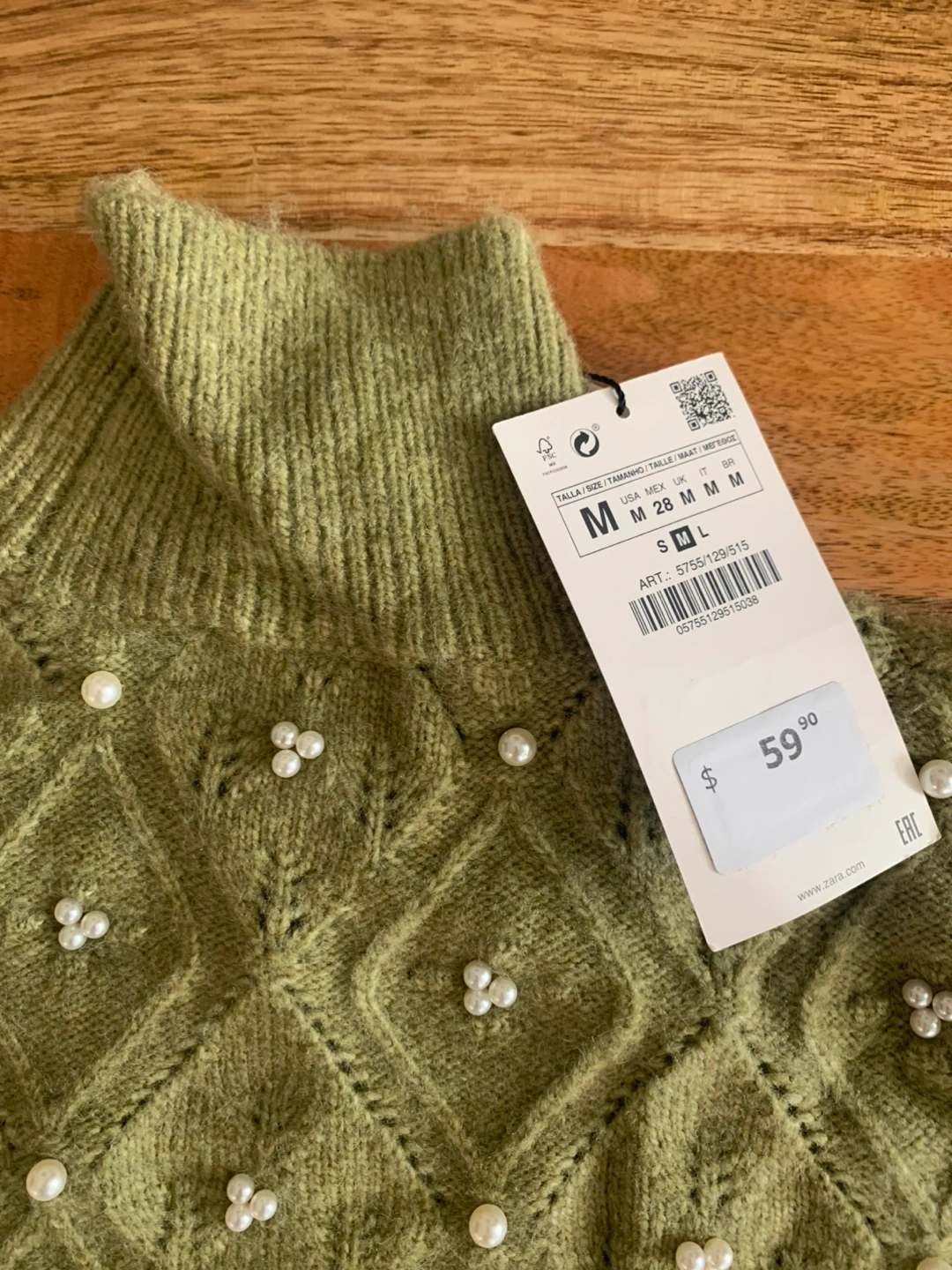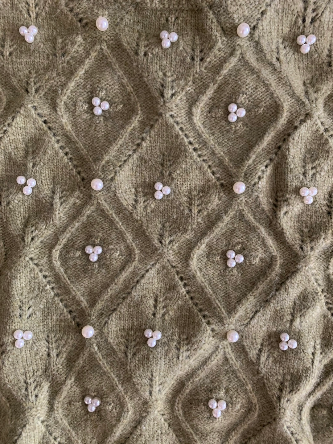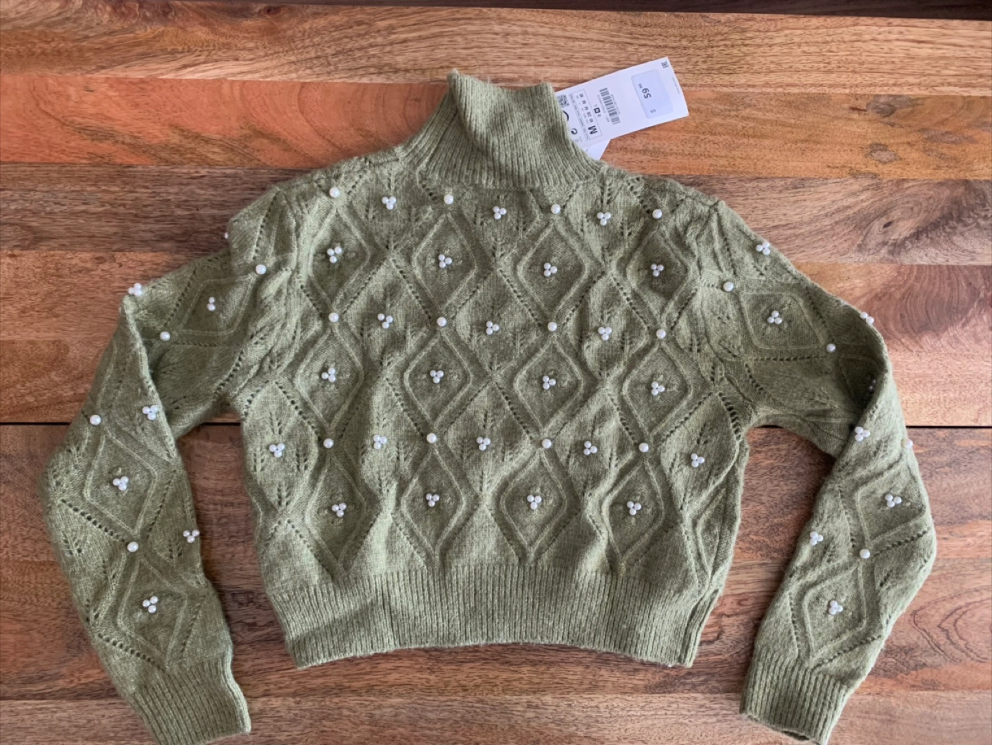 A delightful green sweater. It features a mock neck. Adorned with pearl embellishments and a geometric pattern. Perfect for a cozy afternoon reading a book.