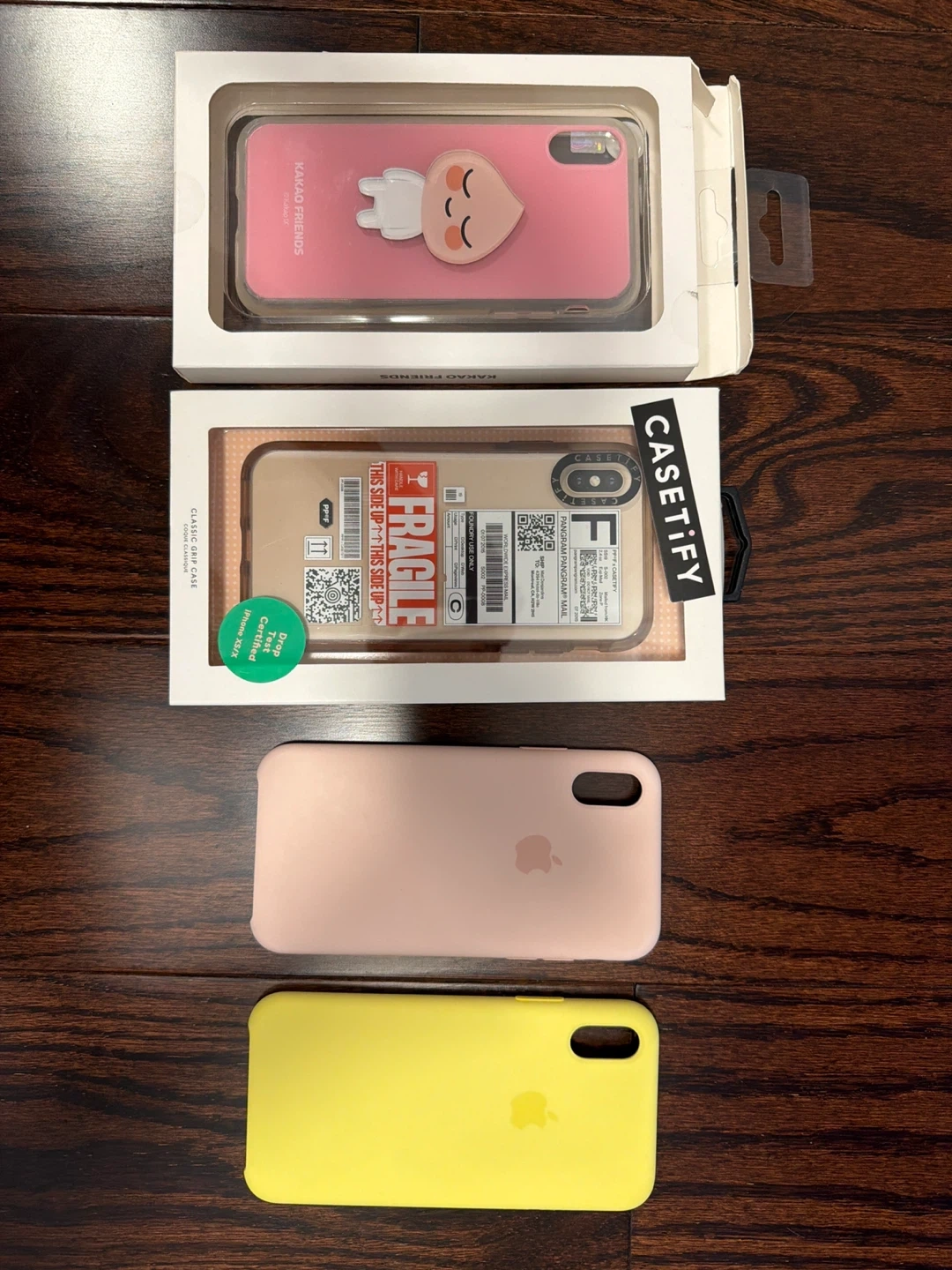 Selling a few iPhone cases! There's a Casetify classic grip case, and a Kakao Friends case. Also including a yellow and pink silicone apple original cases. All in great condition!