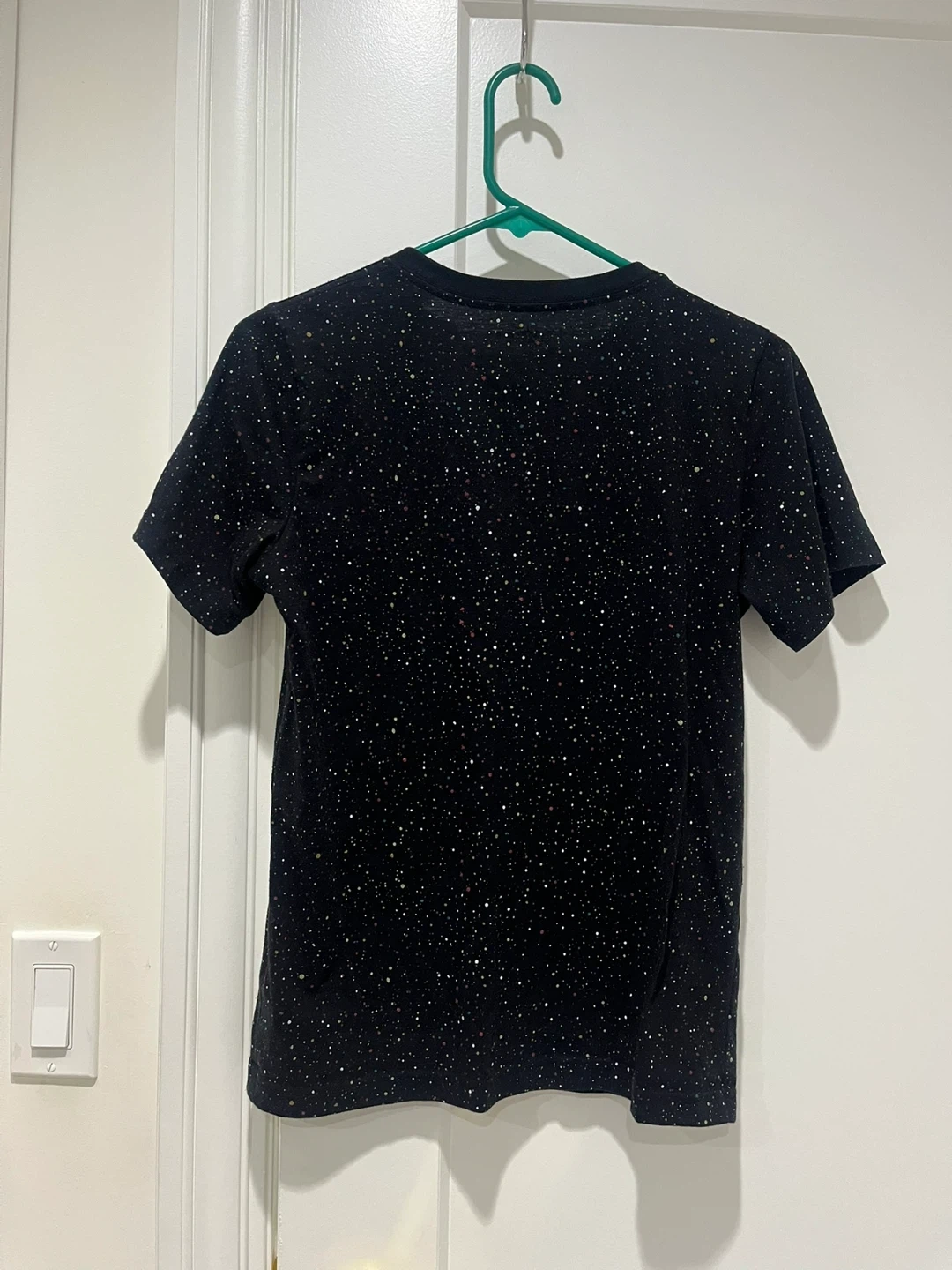 This Jordan t-shirt is black with a multi-coloured speckle print all over. It's a size L, suitable for ages 12-13 years (147-163 cm). Made in Vietnam.
