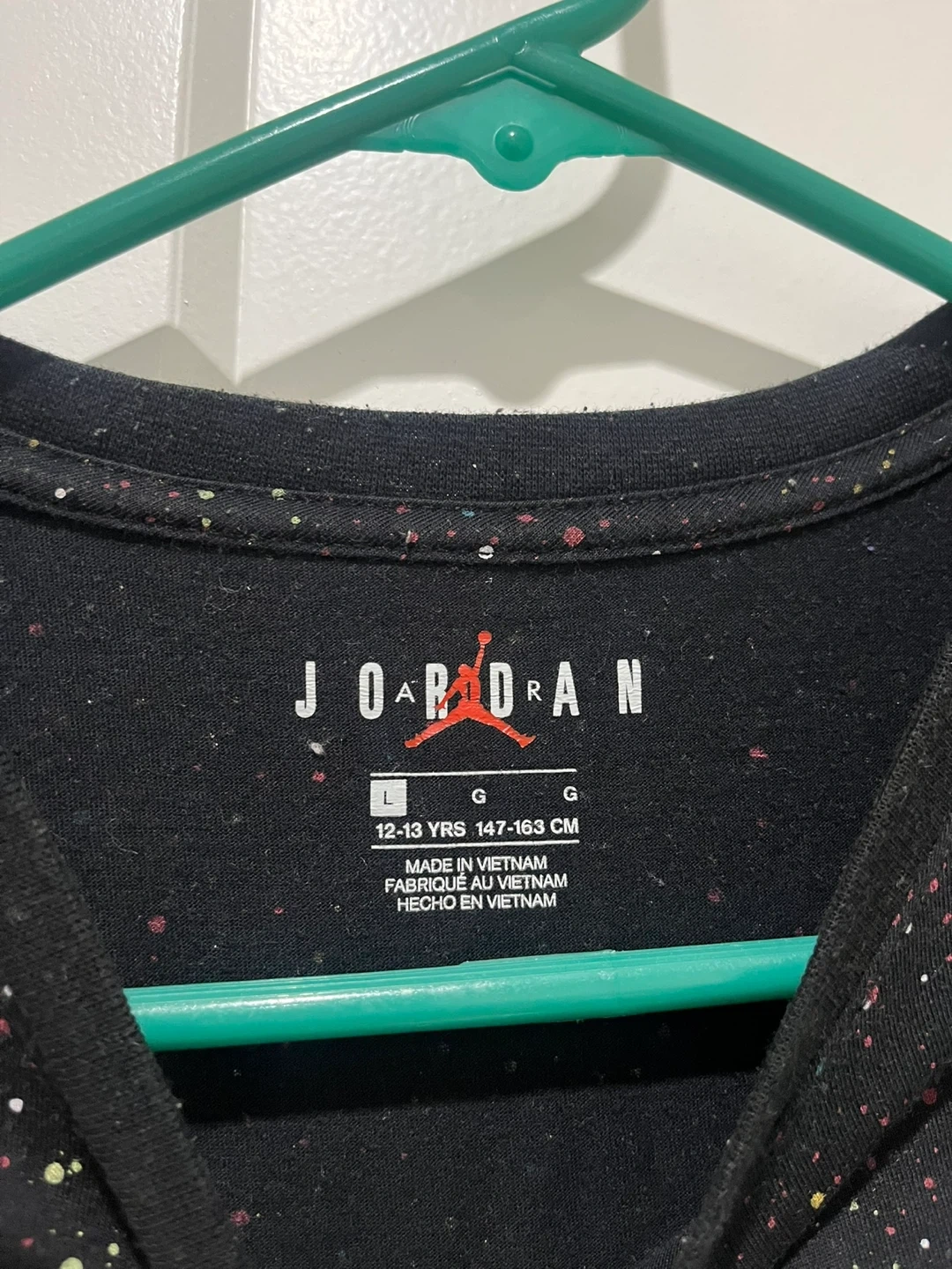 This Jordan t-shirt is black with a multi-coloured speckle print all over. It's a size L, suitable for ages 12-13 years (147-163 cm). Made in Vietnam.