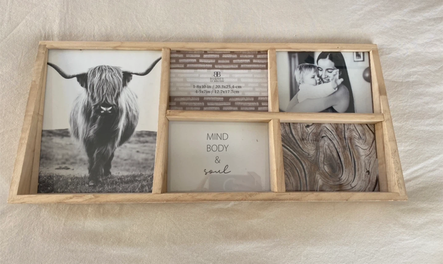 I'm selling a Burnes of Boston multi-photo frame. It features a natural wood finish and holds multiple photos of different sizes. The frame has slots for one 8x10-inch photo (20.3x25.4 cm) and four 5x7-inch photos (12.7x17.7 cm).