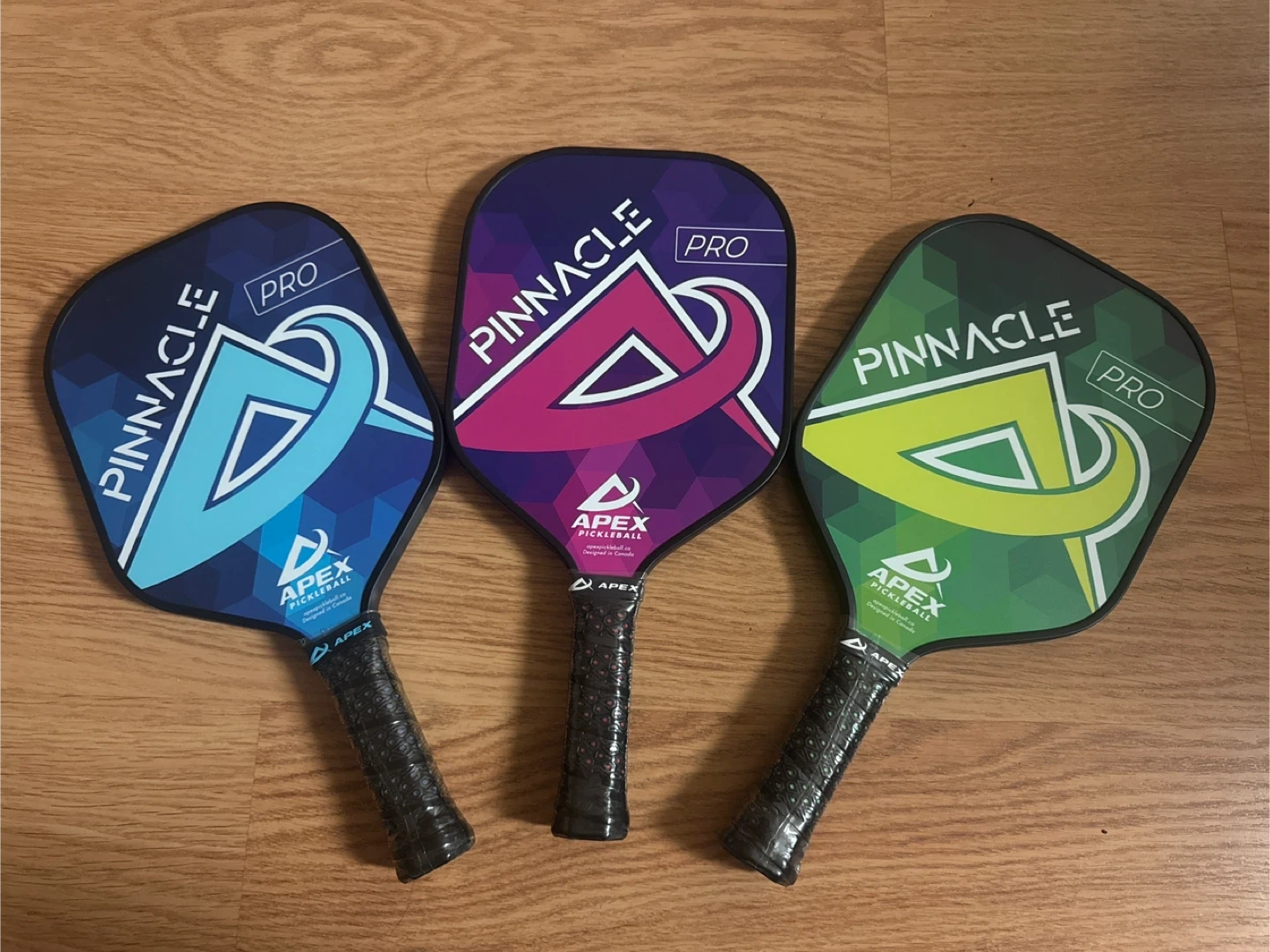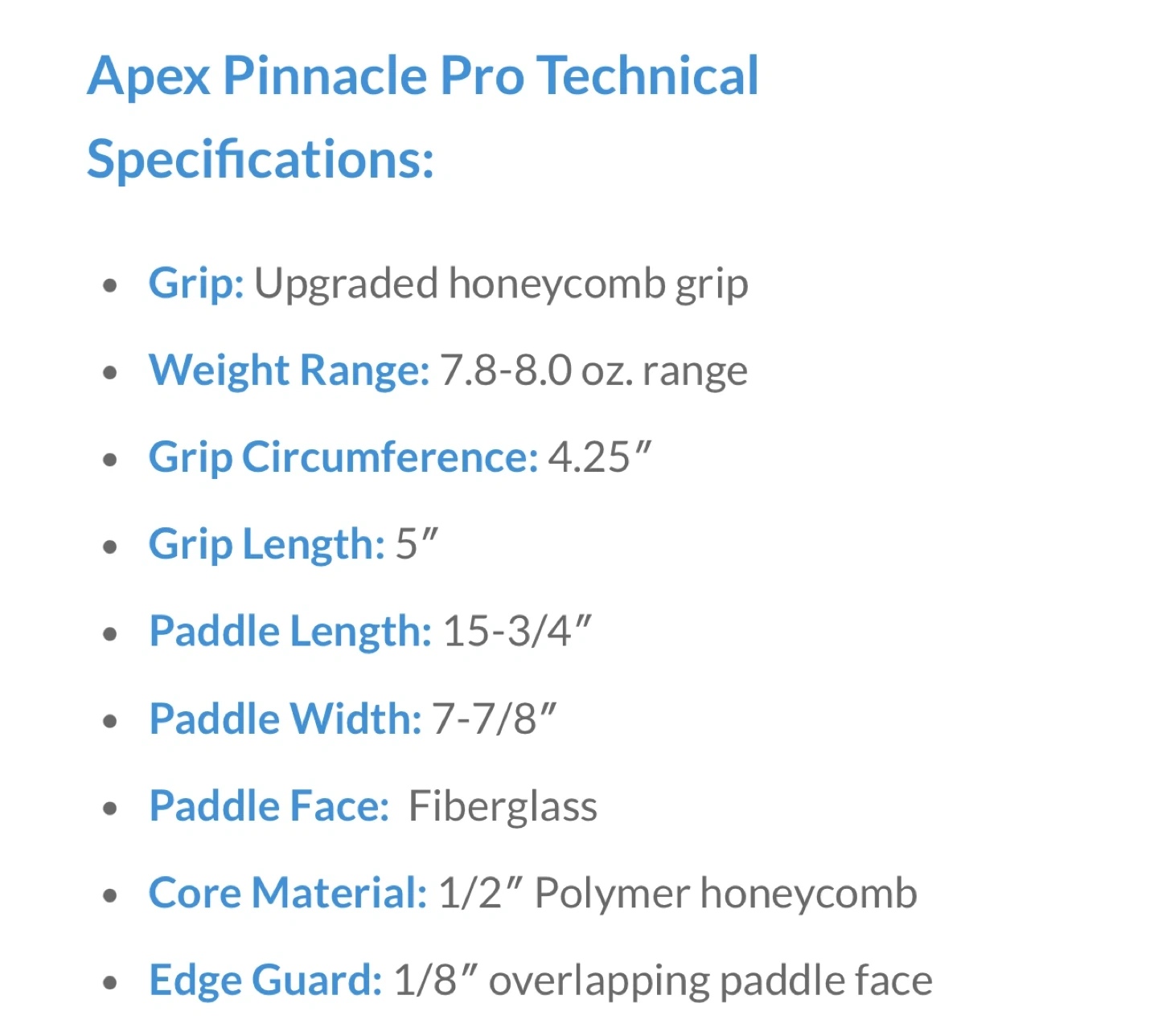 These Apex Pinnacle Pro pickleball paddle features an upgraded honeycomb grip. They have a fiberglass face and a 1/2" polymer honeycomb core. The paddles measure 15-3/4" long and 7-7/8" wide.