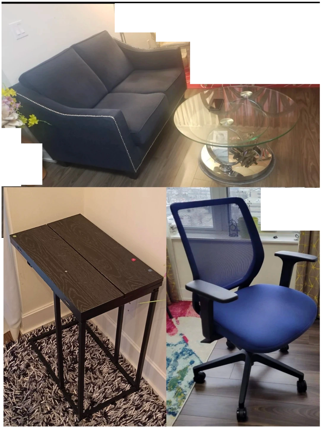 Selling a furniture lot that includes a sofa, coffee table, office chair, and side table. Perfect for furnishing a new space or upgrading your current setup!