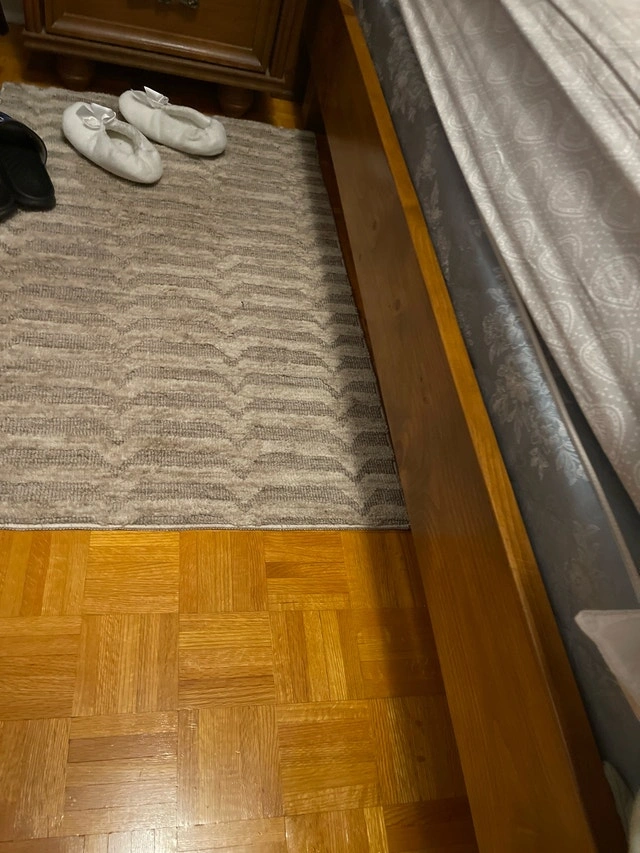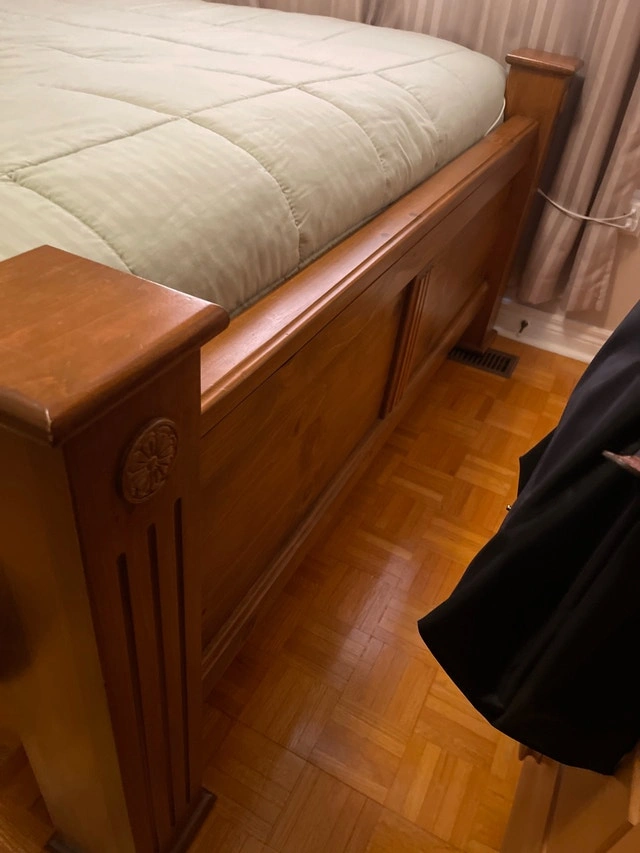 This is a sturdy wooden bed frame, perfect for a master or guest bedroom. It is in good condition, with some minor wear and tear that adds to its vintage charm. It features a solid wood construction, including a headboard and footboard with decorative details. Specifications: * Size: Full * Material: Solid Wood * Style: Traditional. I'm pricing mine at $500 and including the mattress and box spring free of charge. If you're seeing this ad, it's still available!