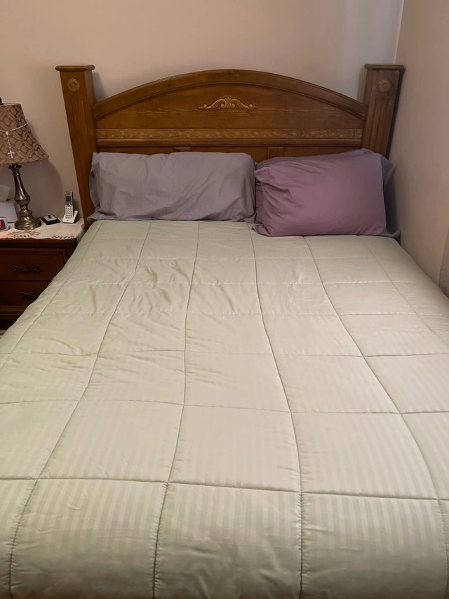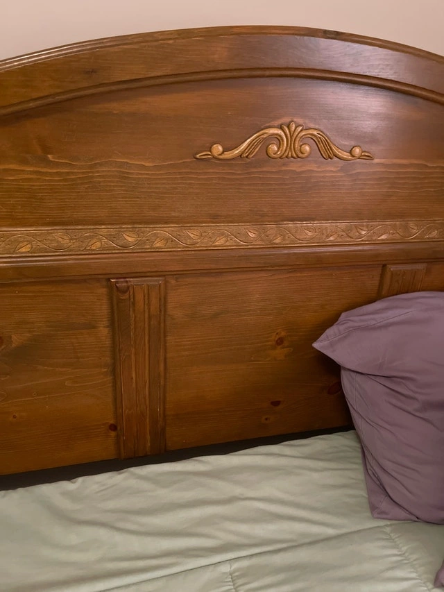 This is a sturdy wooden bed frame, perfect for a master or guest bedroom. It is in good condition, with some minor wear and tear that adds to its vintage charm. It features a solid wood construction, including a headboard and footboard with decorative details. Specifications: * Size: Full * Material: Solid Wood * Style: Traditional. I'm pricing mine at $500 and including the mattress and box spring free of charge. If you're seeing this ad, it's still available!