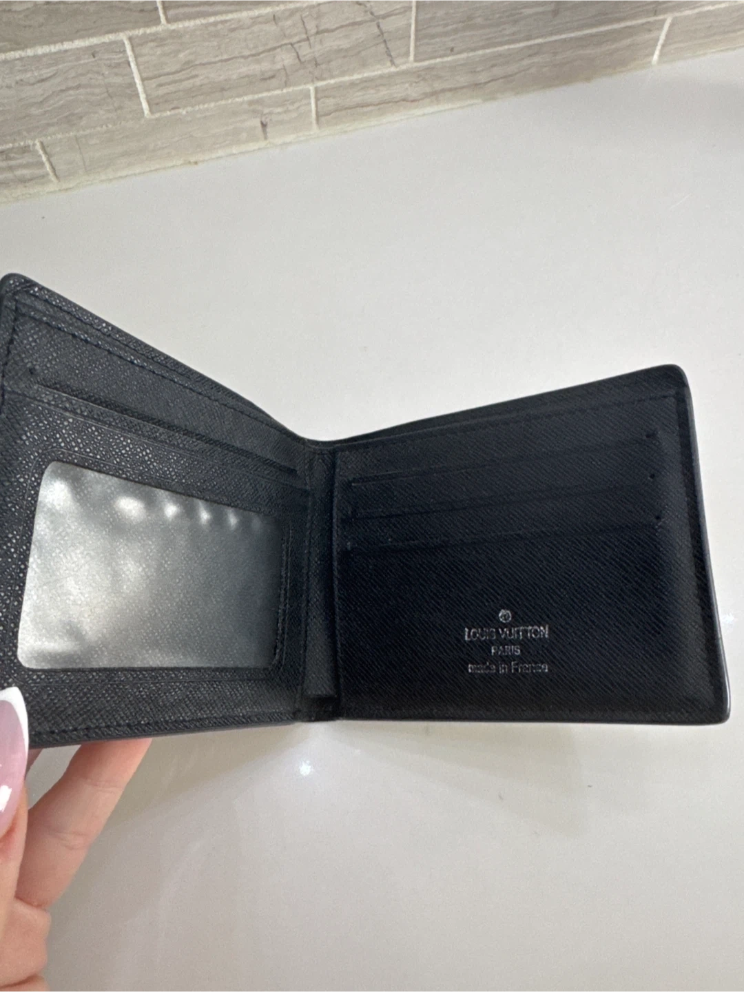 Louis Vuitton bifold wallet in Damier Graphite canvas. It features multiple card slots and a bill compartment. Made in France.