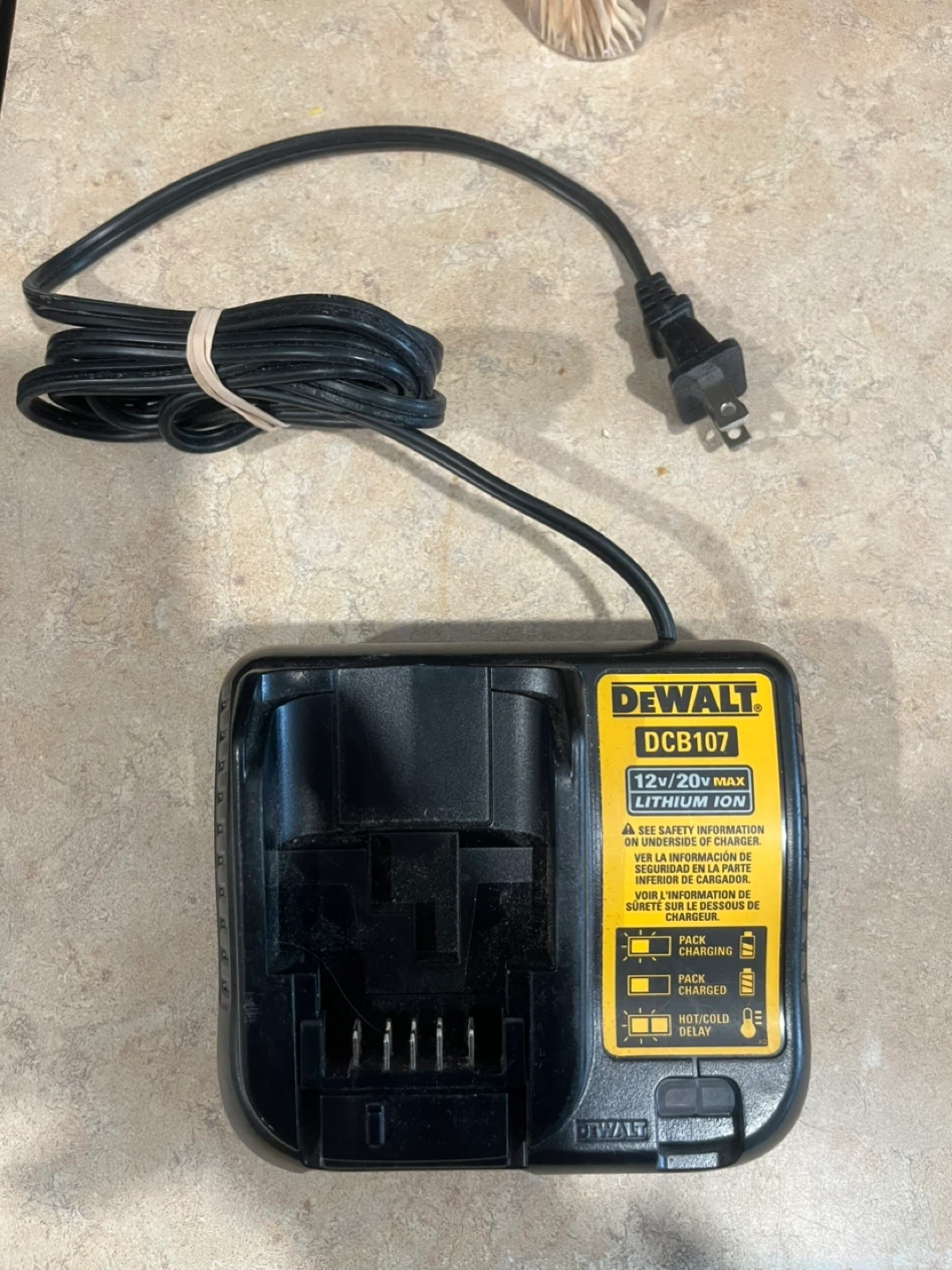 This is a DeWalt DCB107 battery charger. It's designed for 12V and 20V MAX Lithium Ion batteries. The charger has indicators for pack charging, pack charged, and hot/cold delay.