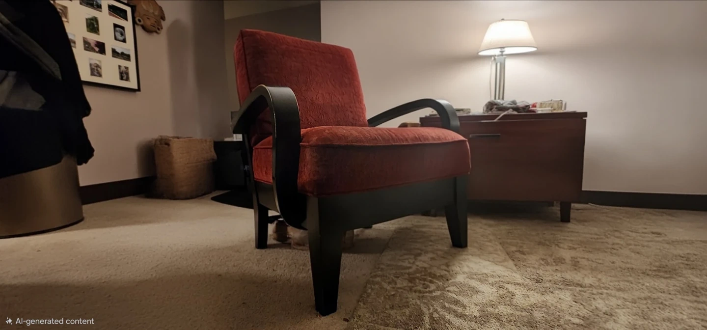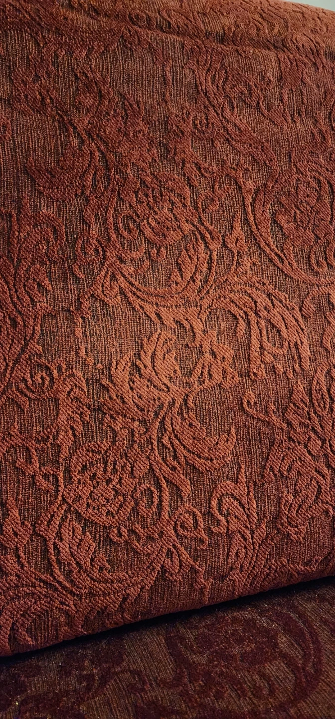 This armchair has a rich red textured fabric upholstery. It features curved black armrests and a sturdy black wooden base. It's a comfortable accent chair for any living space.
