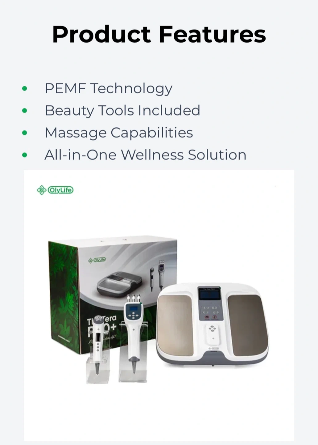 This Olylife Tera P90 Plus device utilizes PEMF & Terahertz technology for cellular repair and improved microcirculation. It also features the Frost Age Beauty Device for skin elasticity and muscle engagement, along with a Revitaluxe Massager for nerve and muscle soothing. Message for free consultation and trial.
