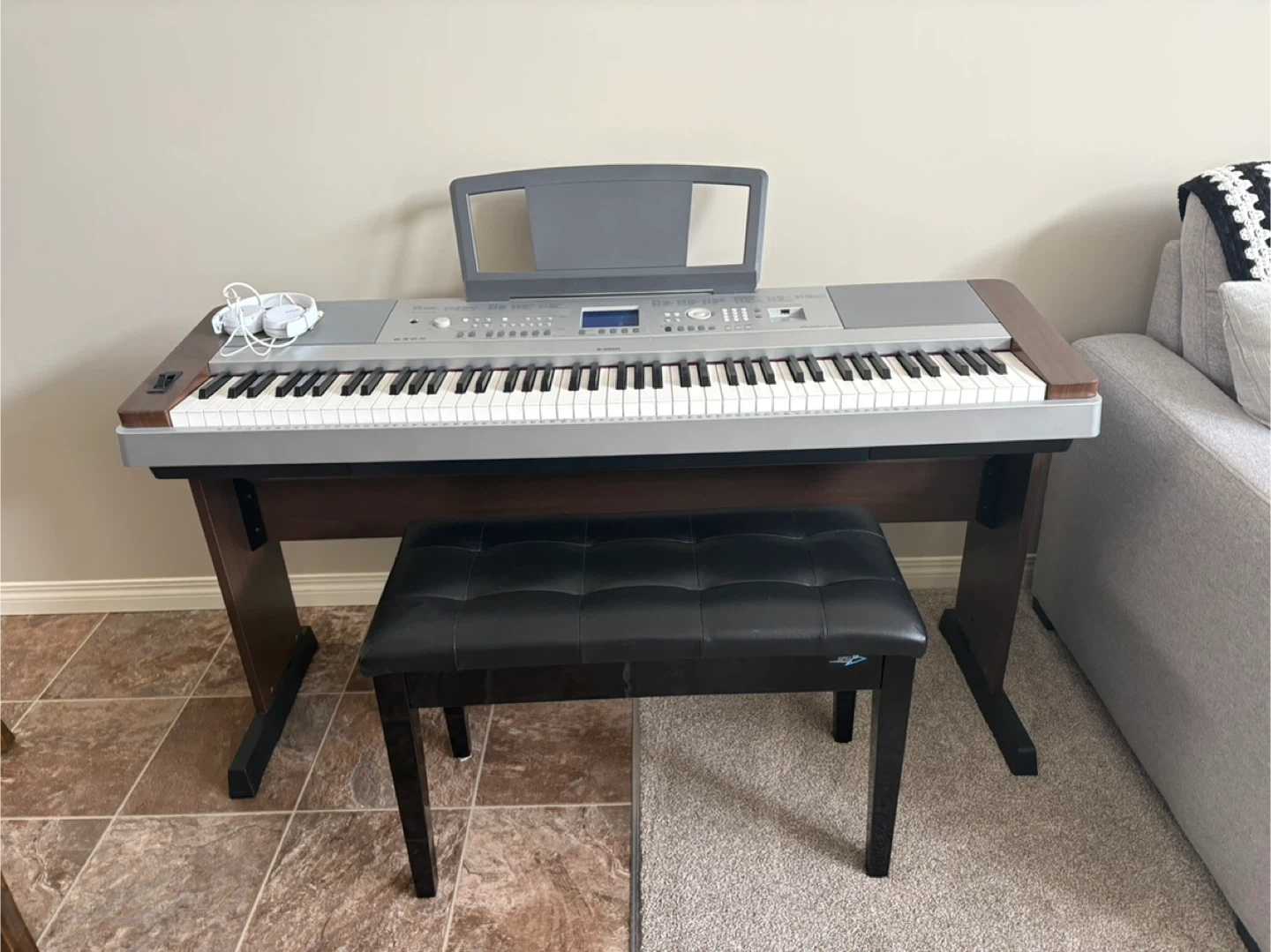Yamaha digital piano with a dark wood finish. Includes a black cushioned bench and a pair of white Sony headphones. Stand for sheet music is also included.