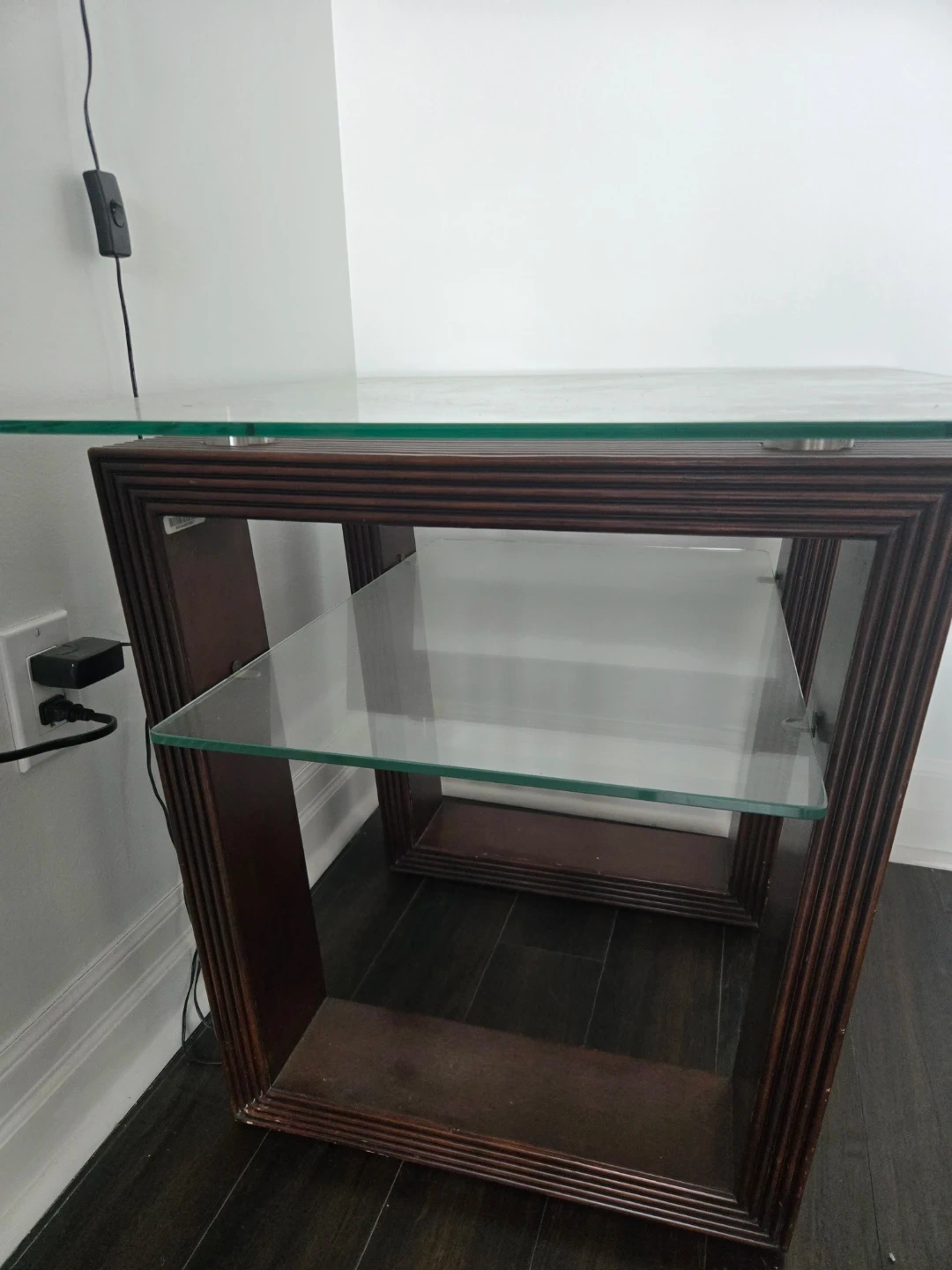 Glass side table with glass shelf in the middle, roughly 40-60 lb, dimensions are 28.5 inches in width 28.5 inch in length and 45 inches in height PICK UP ONLY