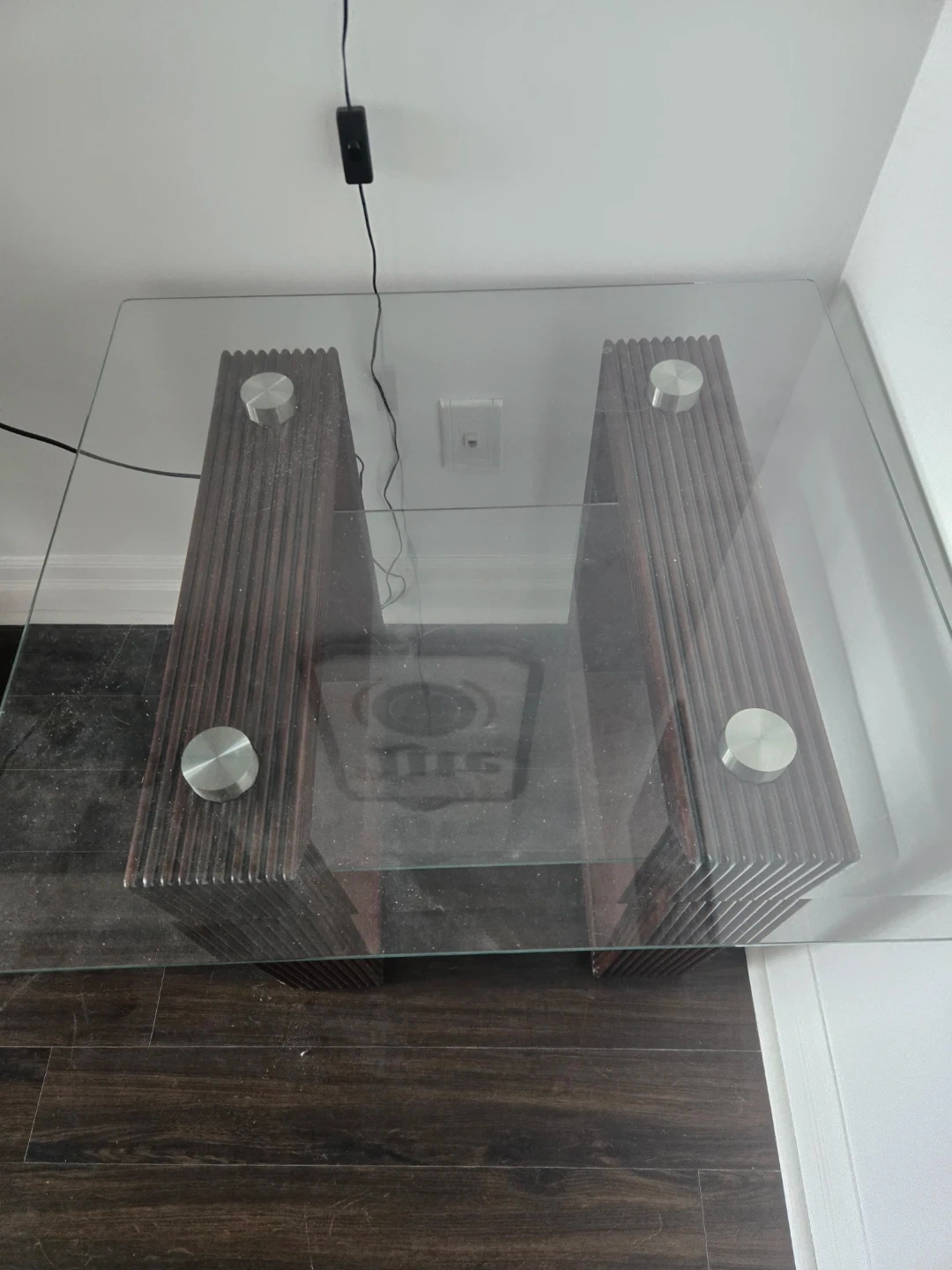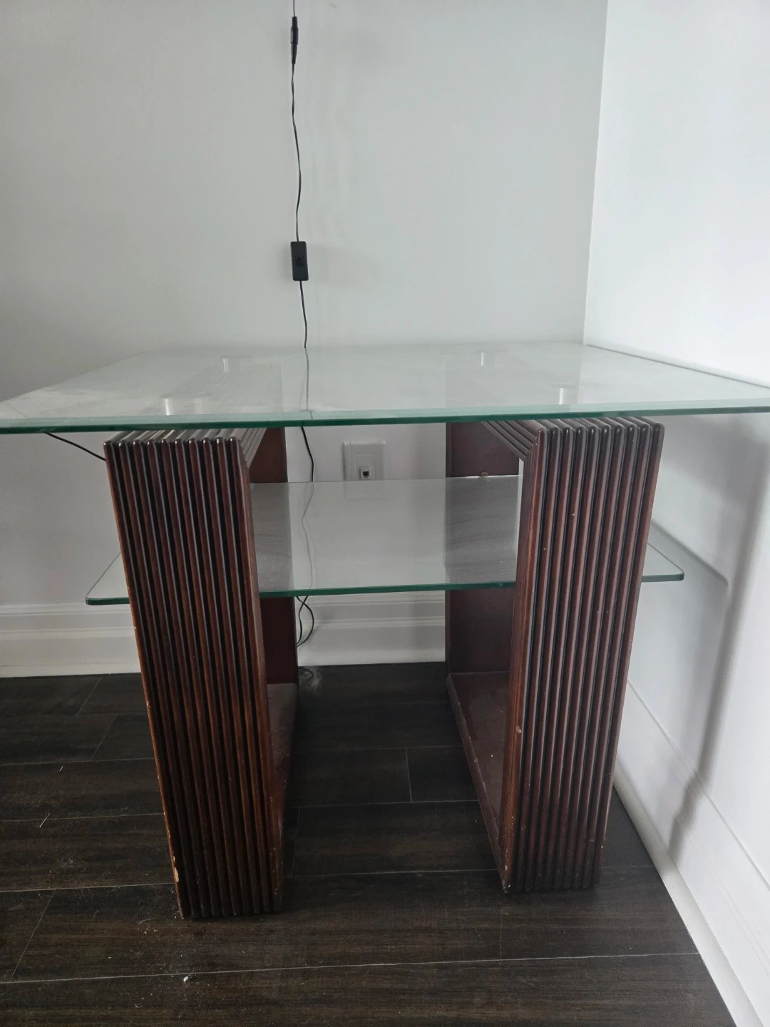 Glass side table with glass shelf in the middle, roughly 40-60 lb, dimensions are 28.5 inches in width 28.5 inch in length and 45 inches in height PICK UP ONLY