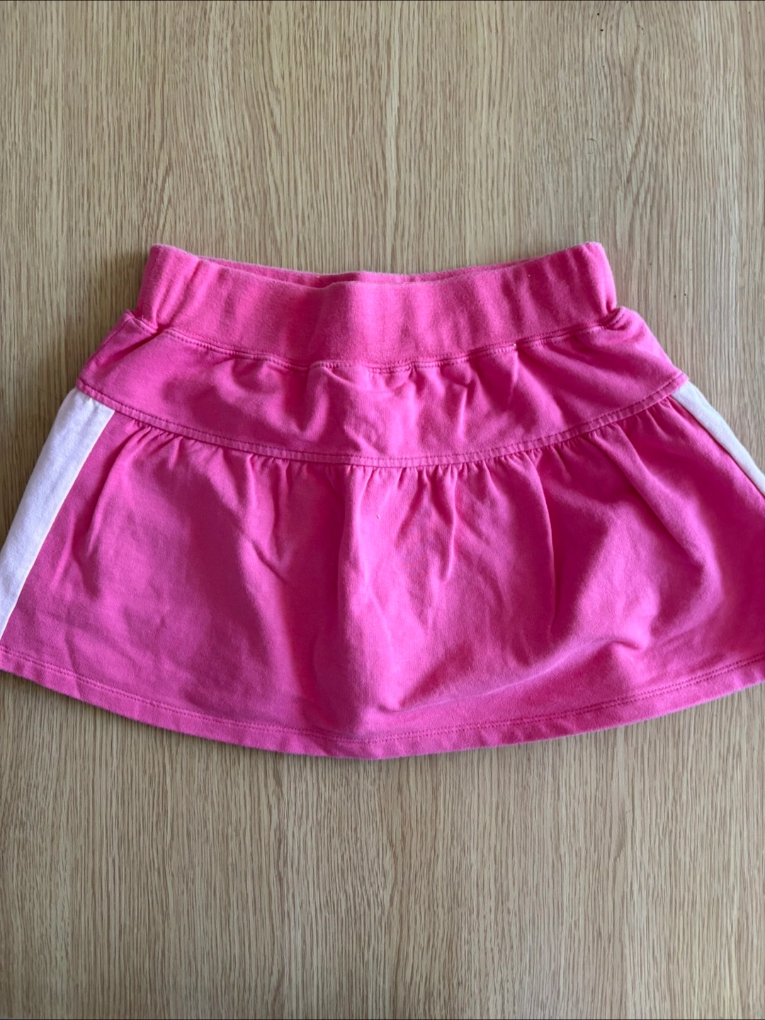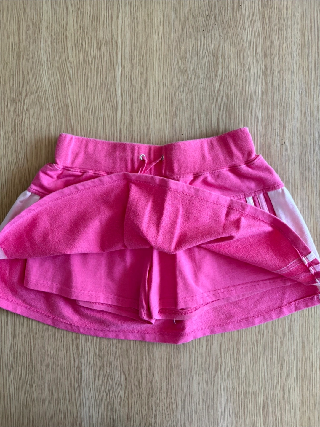 A cute pink athletic skirt with white stripes on the sides by Ardene. It has a drawstring waist. Perfect for sports or casual wear.