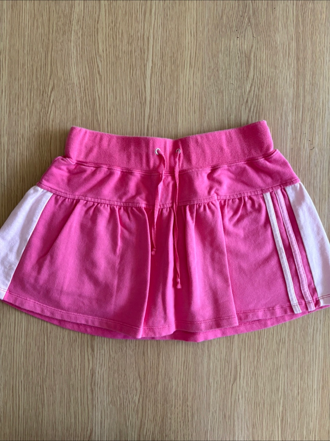 A cute pink athletic skirt with white stripes on the sides by Ardene. It has a drawstring waist. Perfect for sports or casual wear.