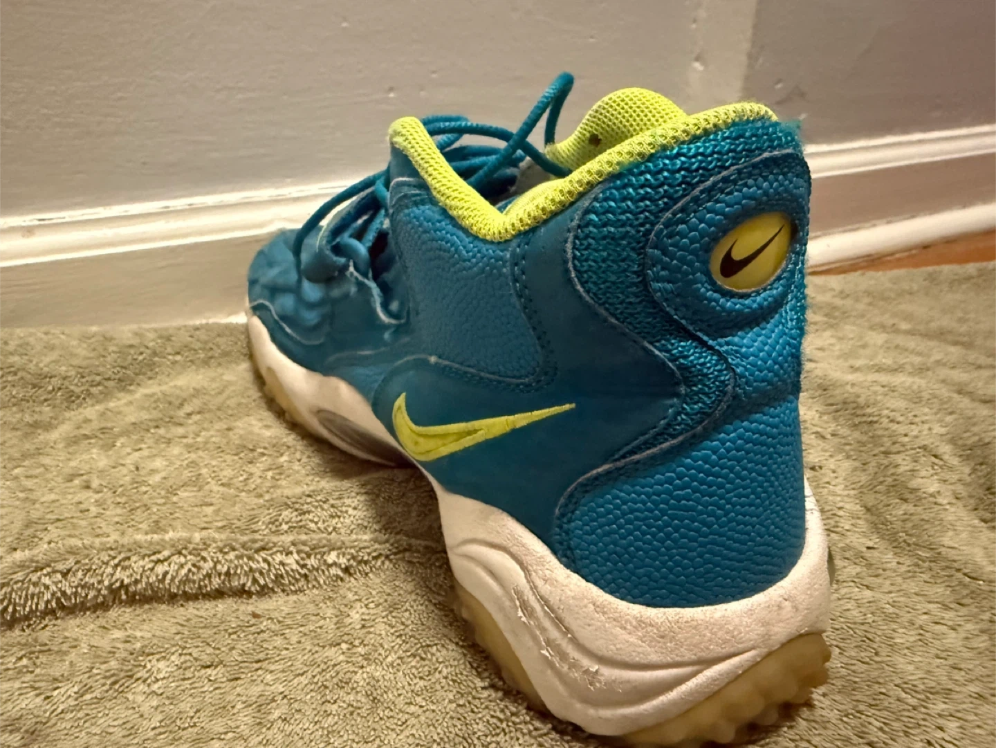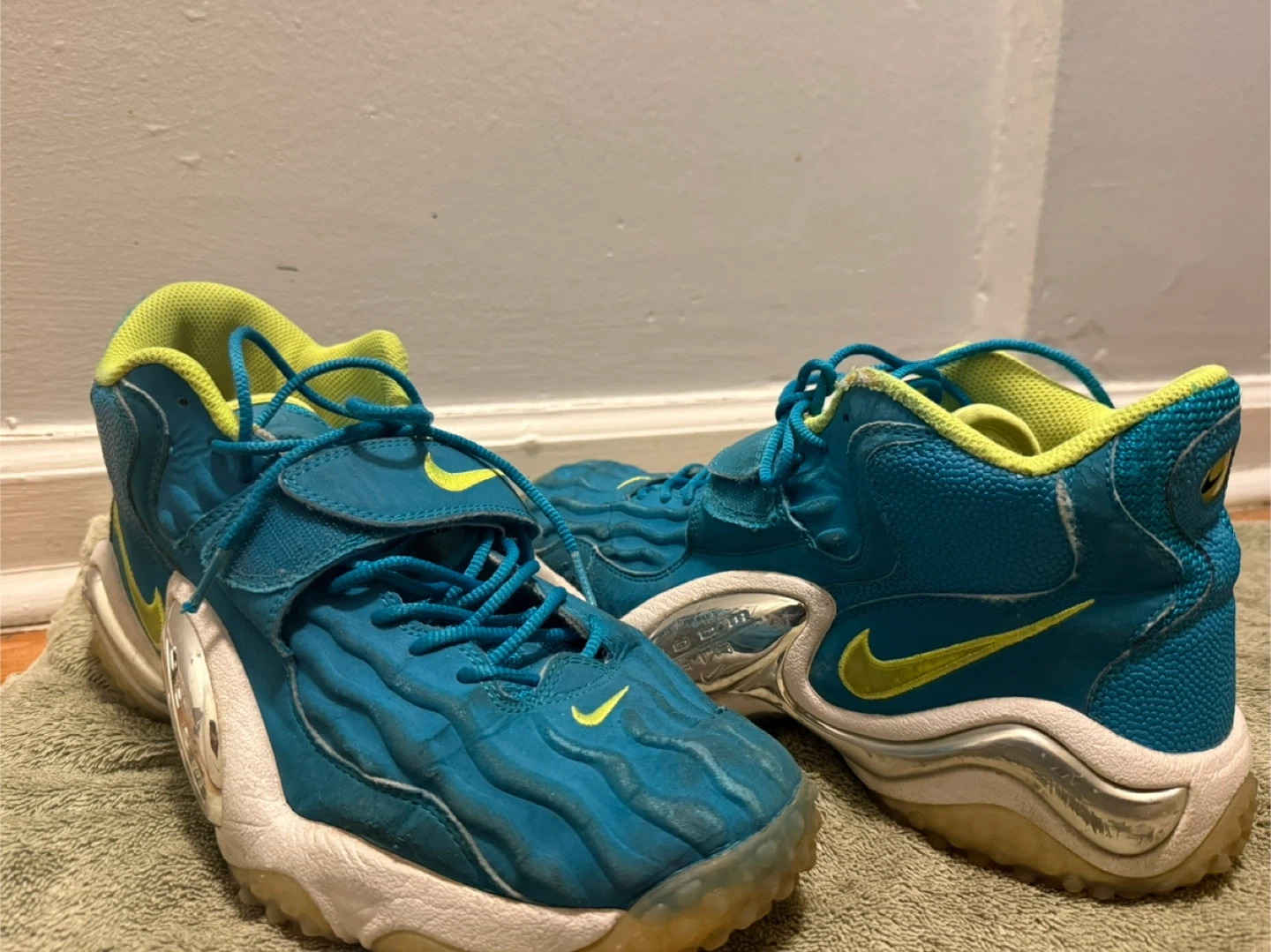 These are Nike Air Zoom turf jet 97 basketball sneakers teal and lime green colorway. They're a US size 10.5,shoes for the indoor court and turf.