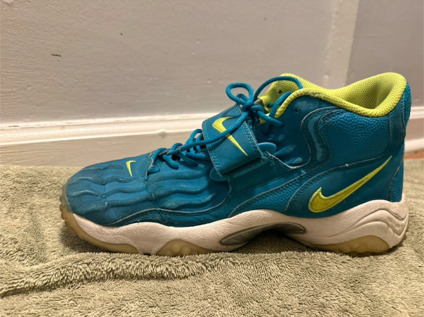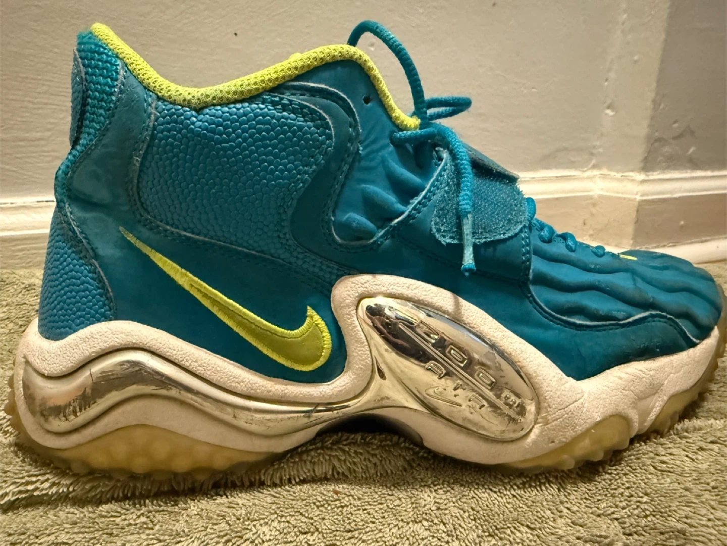 These are Nike Air Zoom turf jet 97 basketball sneakers teal and lime green colorway. They're a US size 10.5,shoes for the indoor court and turf.