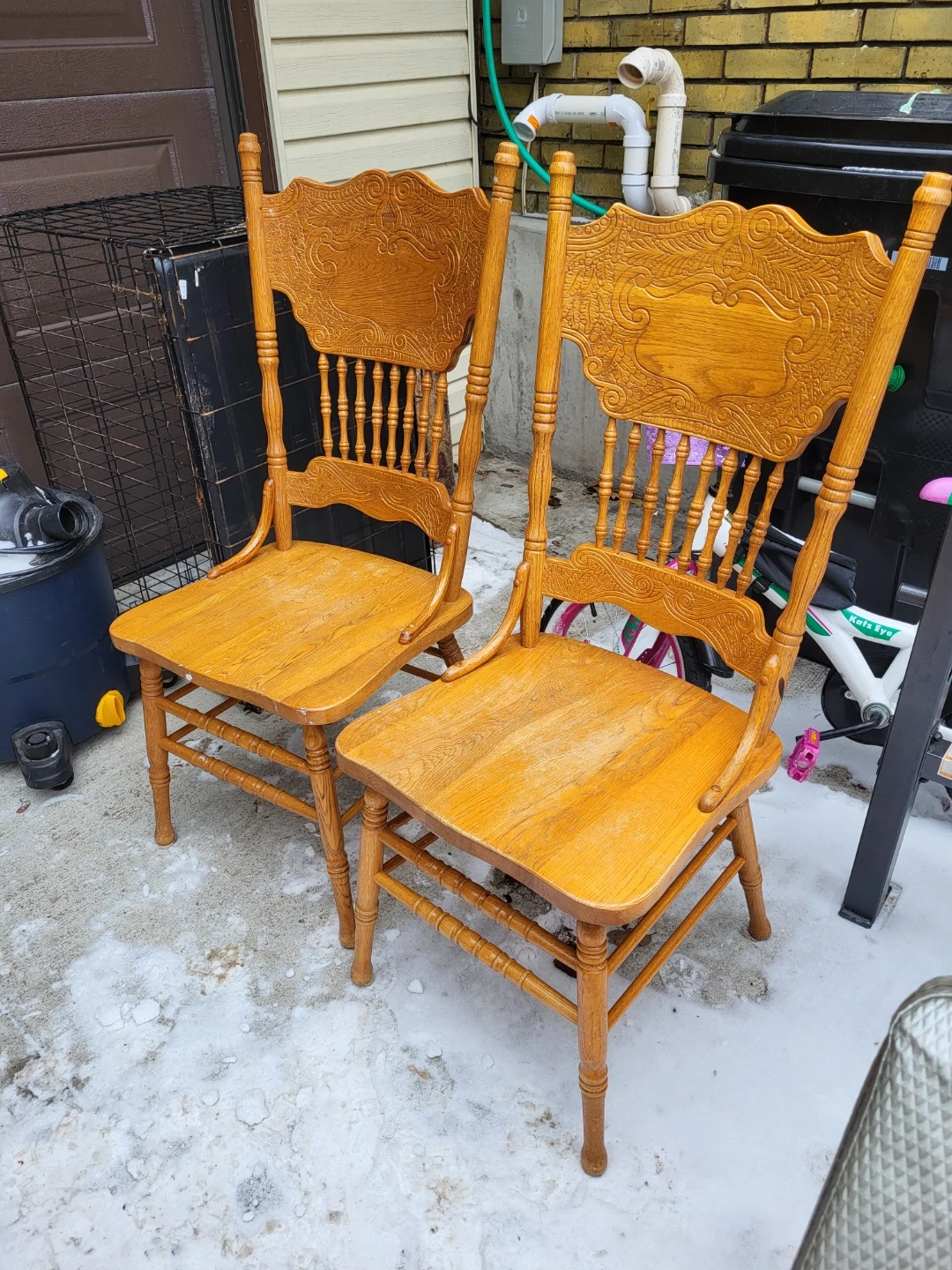 This is a set of two vintage wooden dining chairs. They feature ornate carved detailing on the backrests and a warm oak finish. Wood construction ensures durability.