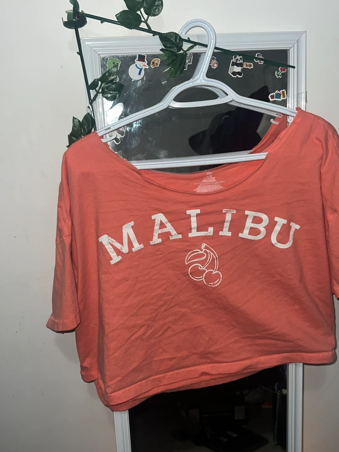 Coral coloured cropped t-shirt with 'Malibu' graphic and cherry detail. Short sleeves and a wide neckline.