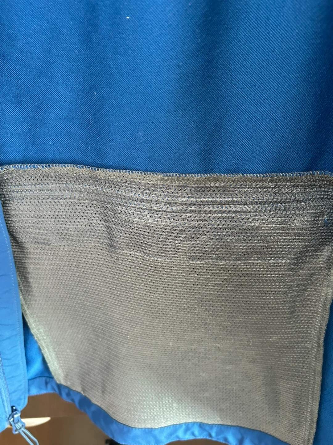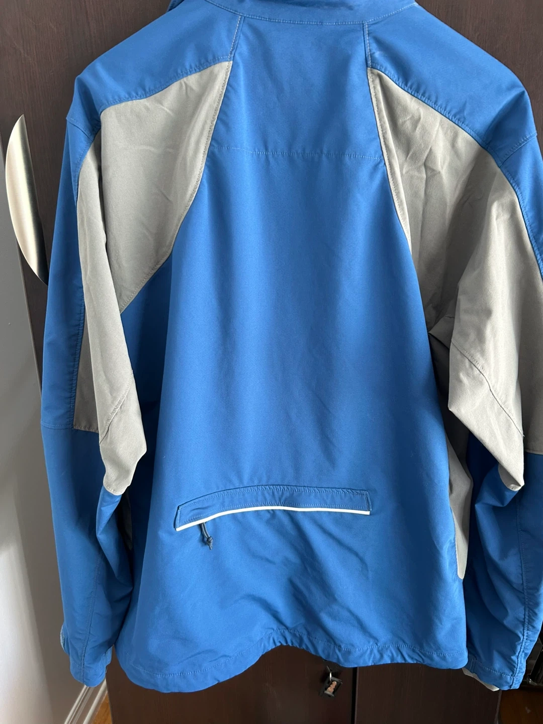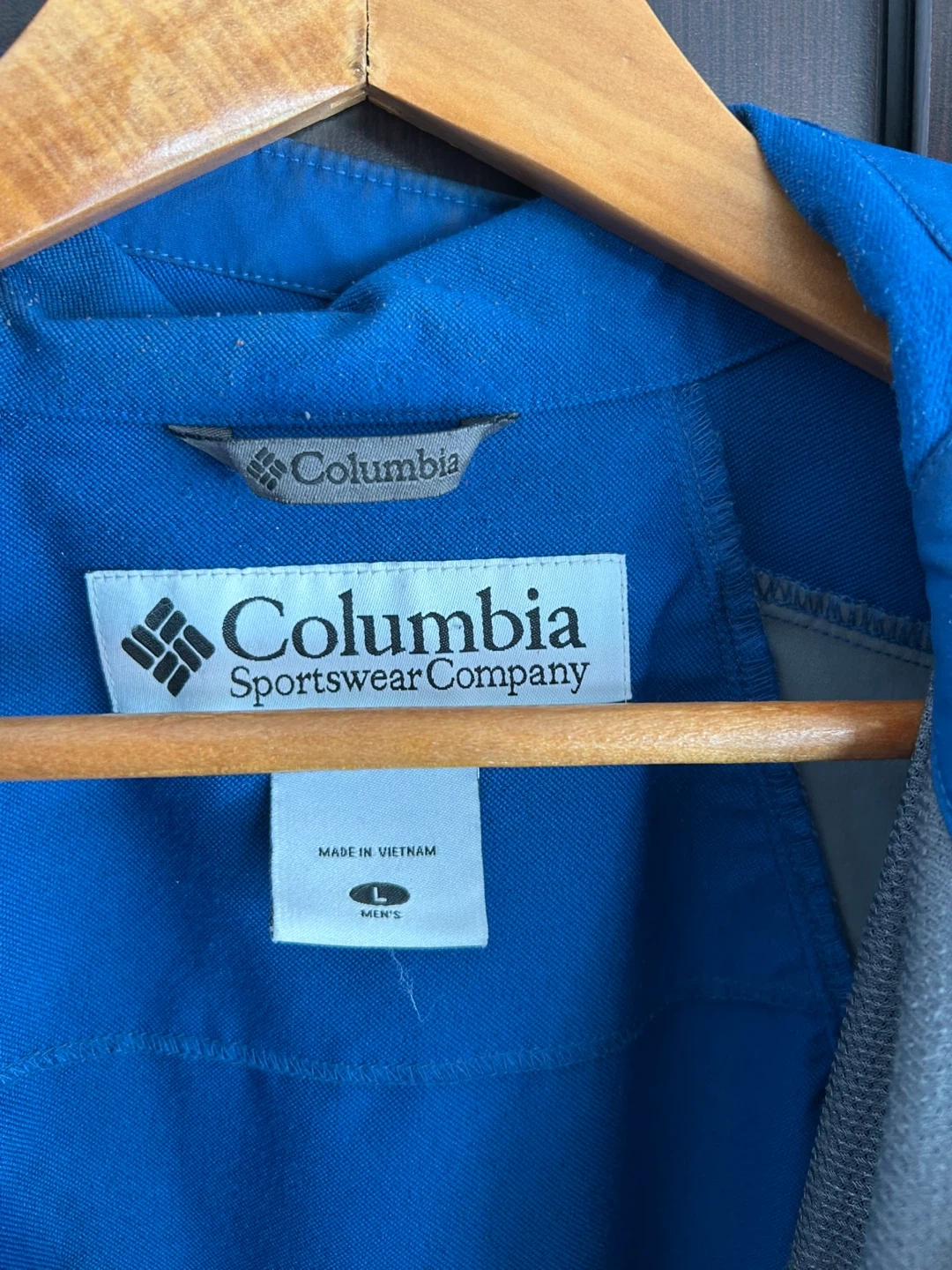 Columbia Sportswear Company jacket in a vibrant blue colour. It's a men's size large. Features adjustable velcro cuffs and multiple zippered pockets for secure storage. Made in Vietnam.