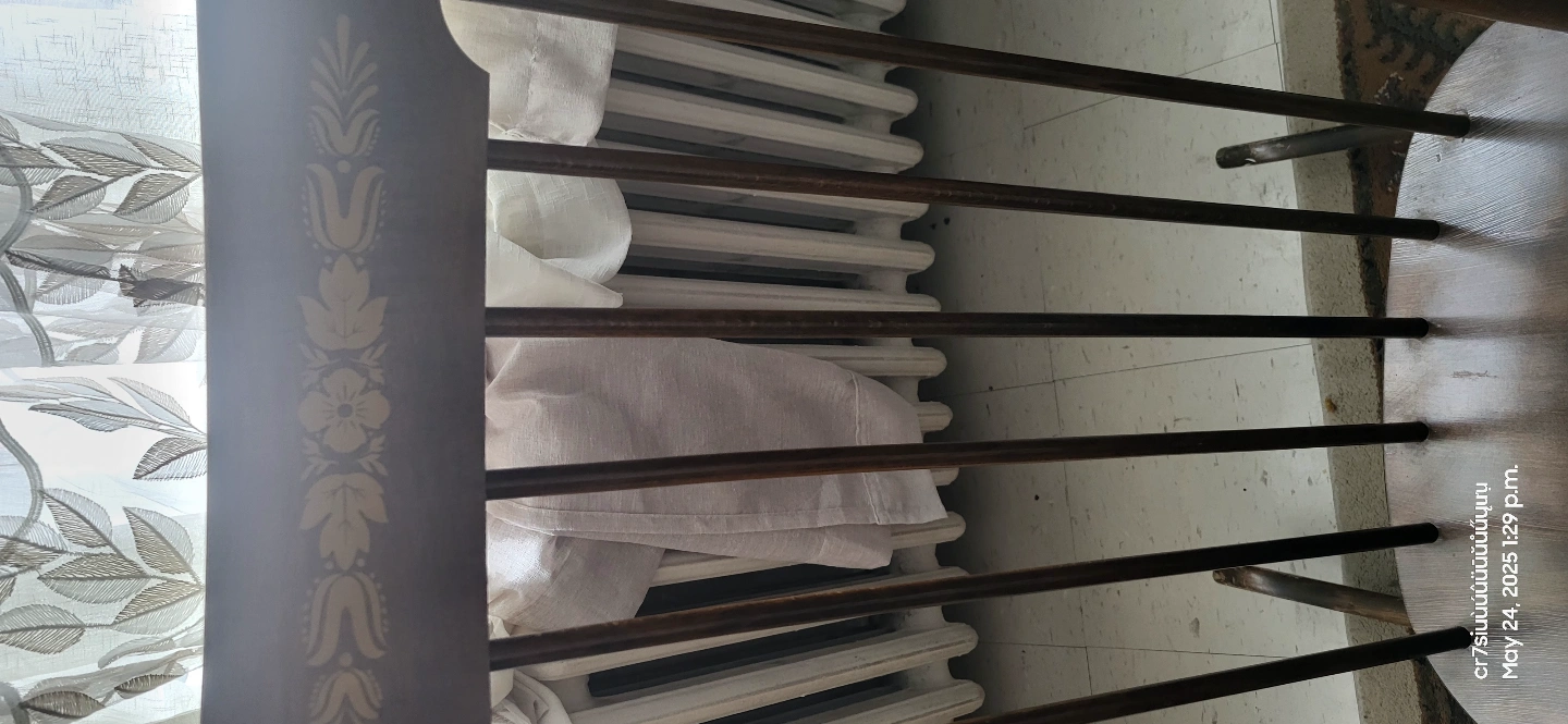 Solid wood rocking chair. Features a classic spindle back and gently curved arms. Shows some minor wear consistent with age and use. Ideal for a cozy reading nook or bedroom.