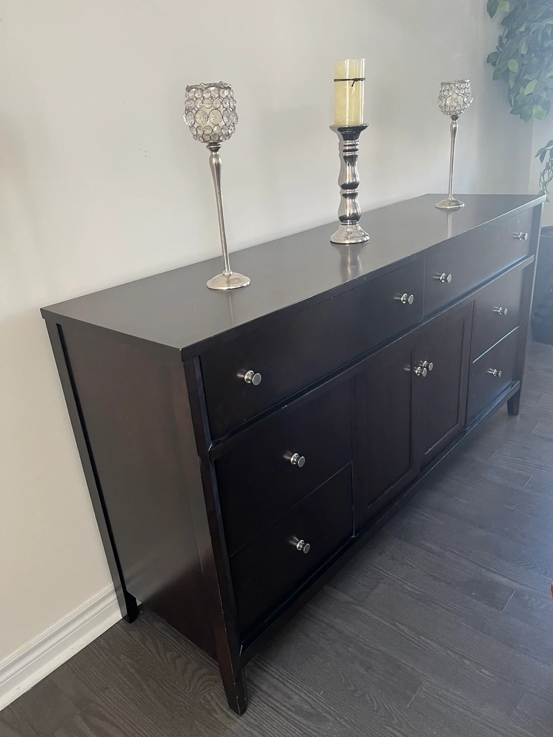 This dark brown dresser offers ample storage with its eight drawers. Its sleek design fits well in many bedroom styles. It's 1.67m in length.