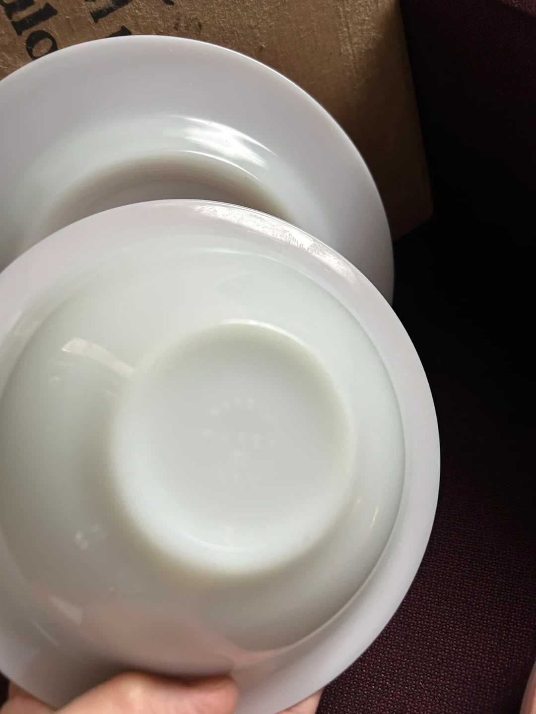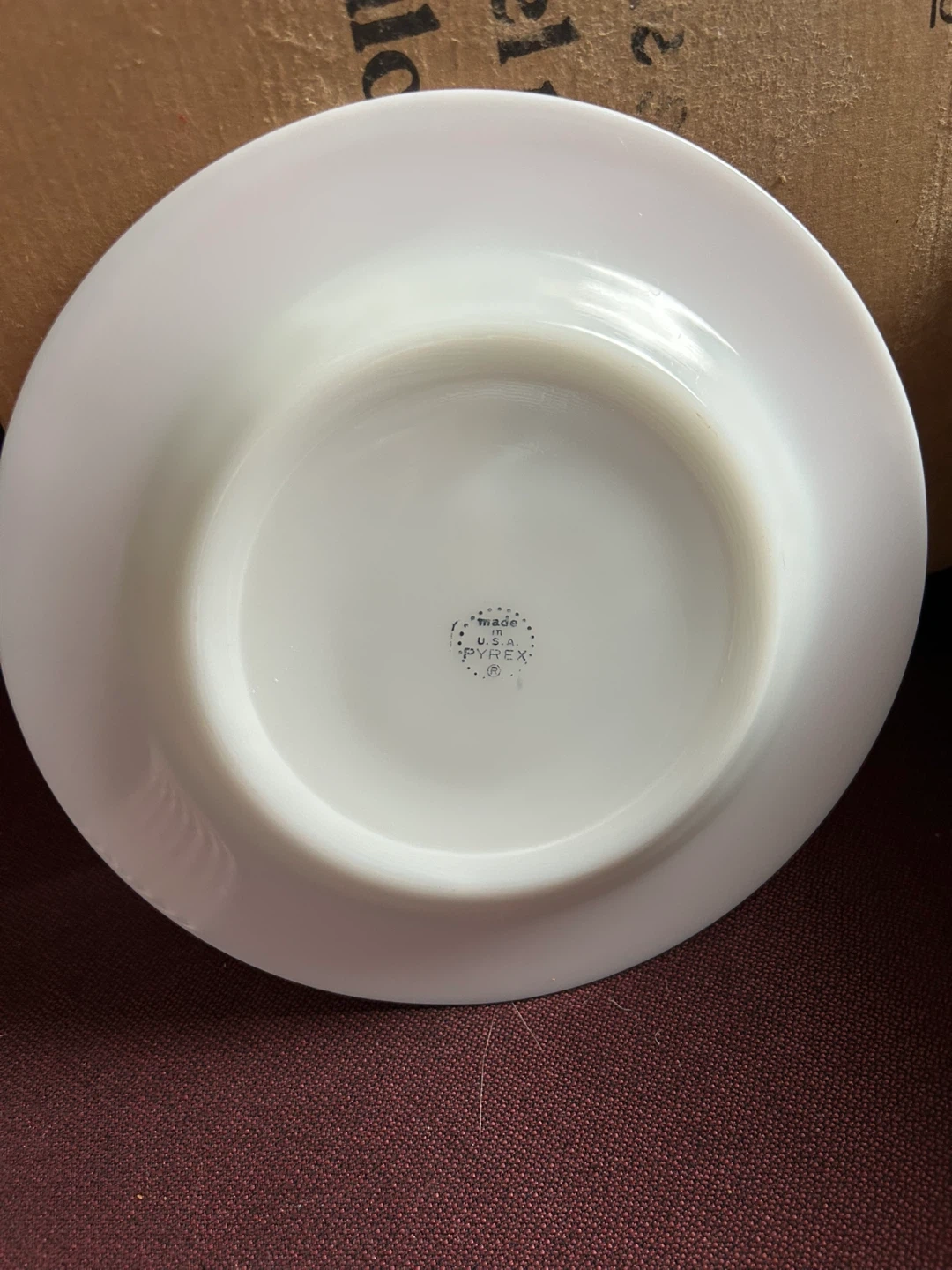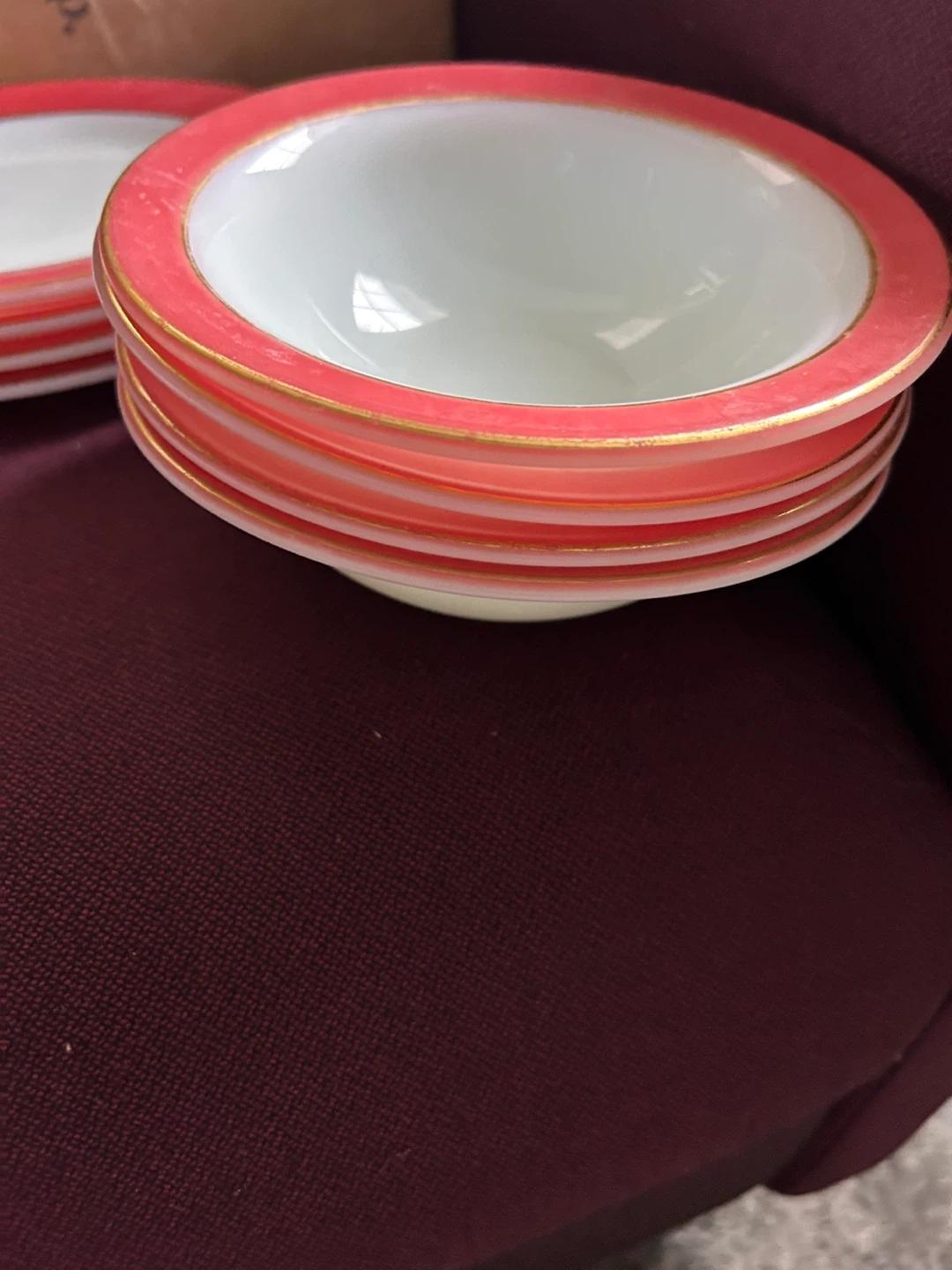 Selling a set of bowls and plates with a coral rim. They have a lovely gold trim. Perfect for adding a pop of colour to your table setting! This is a set of 4 big bowls medium bowls am d4 bowls. These are pyrex. Very nice shape.